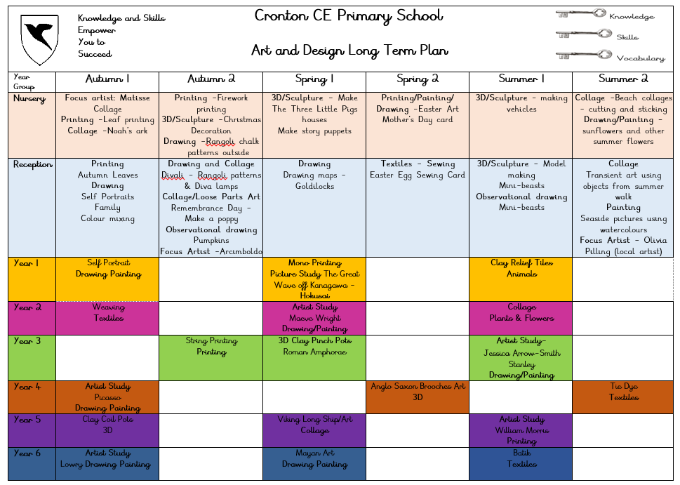 Skills and knowledge are developed throughout each art topic and are mapped across the school to ensure progression. Across Key Stage One, Lower Key Stage Two and Upper Key Stage Two, the children will have the opportunity to develop their creative knowledge and skills across a variety of art disciplines: drawing, painting, textiles, printing, collage and sculpture. The sequence of lessons will include: