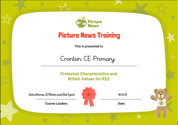 The school uses Picture News on a weekly basis to look at topical news stories that make the children think about their life and how their voice is important. It focuses on the British Values and how they link with current stories in the news. We also look at the protected characteristics and discuss what these mean. The children discuss and we record their answers in a scrapbook or display.