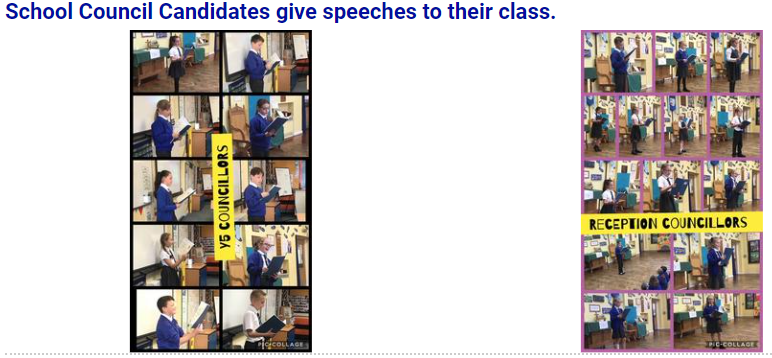 Democracy is rife within the school. Pupils have the opportunity to have their voices heard through our School Council and Pupil questionnaires. The elections of school councillors take place and are a democratic vote. The children give speeches and the class vote using a box and form to choose their candidate.