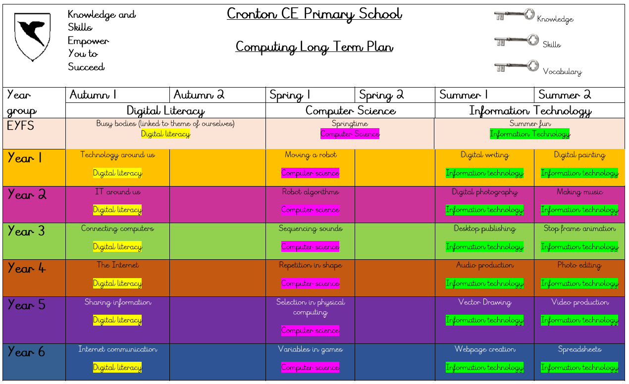 The curriculum is progressive and builds upon prior knowledge and skills taught throughout the year groups. Our aim is that by the time all children leave Cronton they are responsible, competent and creative users of information and communication technology, who can confidently analyse and solve problems involving technology.