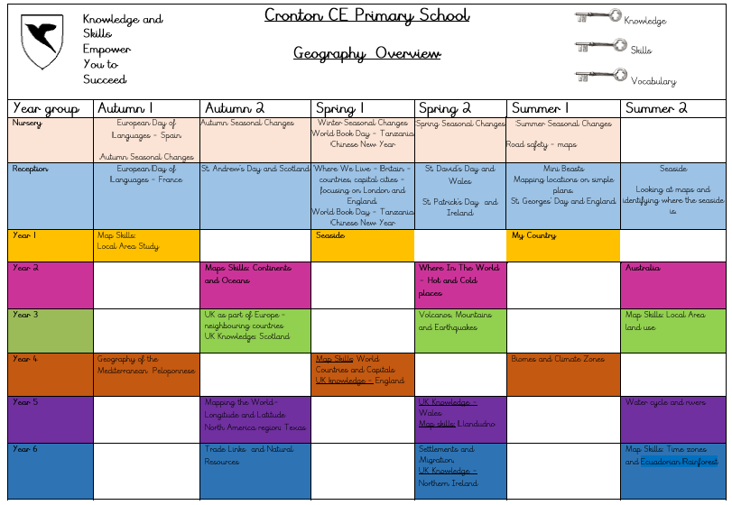 Our Cronton Geography Curriculum has been designed in order to achieve full National Curriculum coverage and allow clear progression of knowledge and skills from EYFS to subsequently KS3 by creating diagonal, horizontal and vertical links, which allow opportunities for the pupils to revisit and build upon their previous learning hence altering their long term memory.
