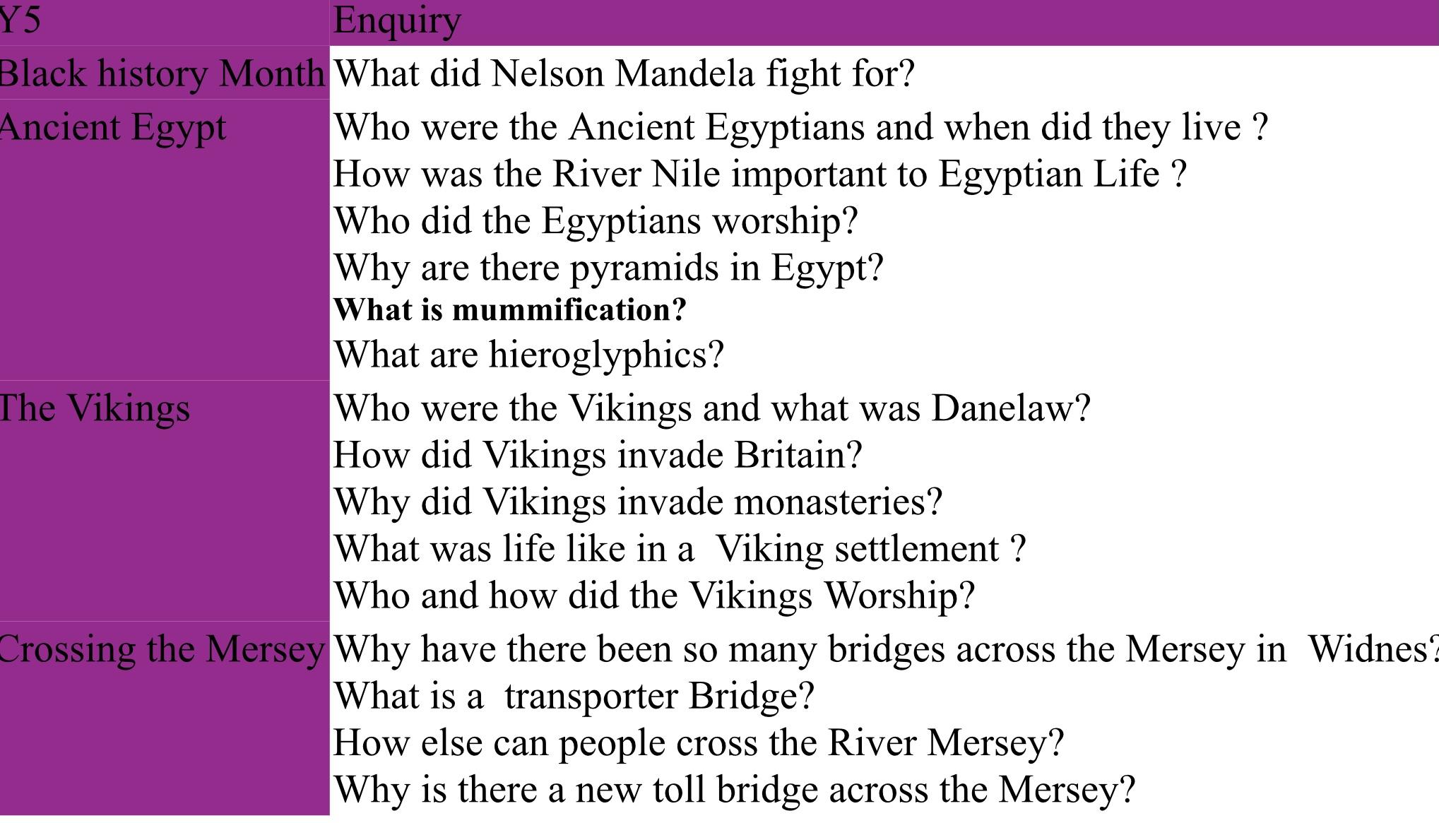 In KS 1 classes study significant people and events and aspects of change over time. In KS2 the curriculum is mapped out broadly chronologically with each KS2 class studying an ancient era as well as a period of British history. Each year group also studies an aspect of local history. In KS1 these link in with local important events and local significant people and in KS2 children learn about the local area starting with the immediate vicinity of our school and village in Y3 with Cronton, and leading out to the city of Liverpool in Y6.