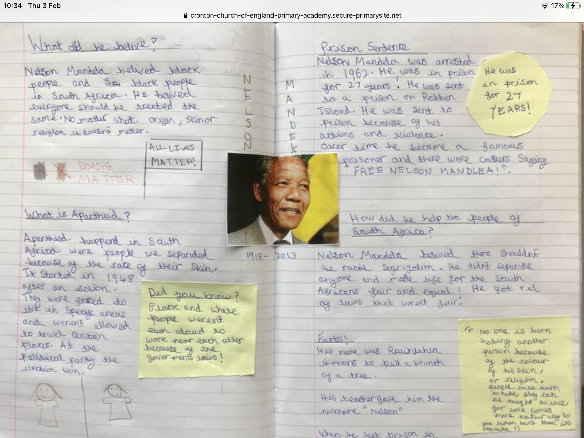 As part of Black History Month in October children in year 5 will be taught about the life of Nelson Mandela and what he fought for.