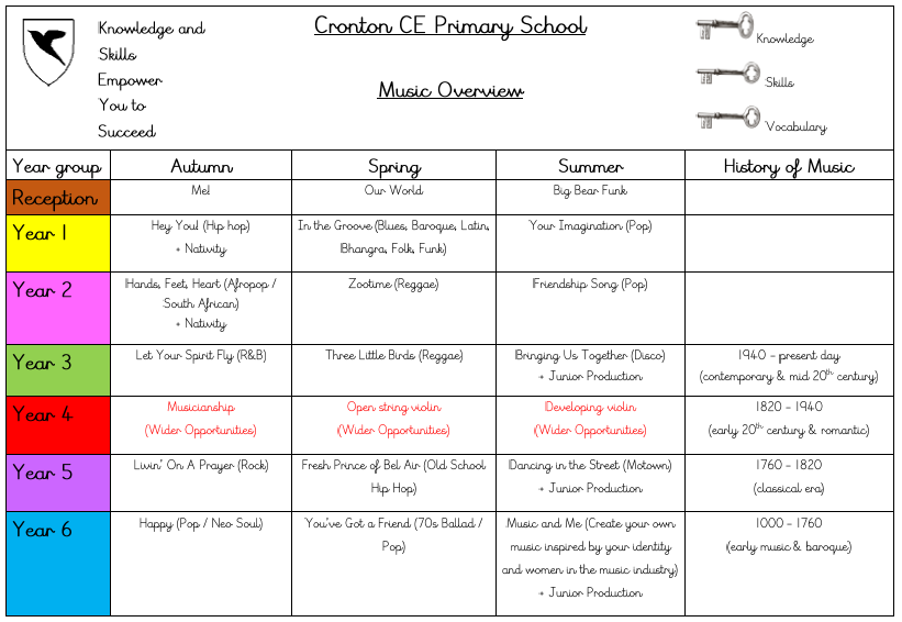 At Cronton CE we aim to foster an enjoyment and appreciation of music. This includes the development of an understanding of the interrelated dimensions of music: pitch, dynamics, duration, tempo, timbre, texture and structure. Furthermore, we aim to encourage self expression through music and to develop an awareness of the music of ours and other cultures including an awareness of a variety of musical styles.
