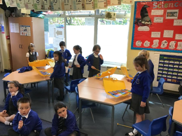 • Playing instruments with the song to be learnt - tuned/un-tuned classroom percussion. A sound-before-symbol approach is used but scores are provided as an understanding of notation is introduced to the children.