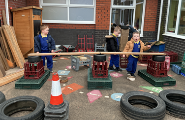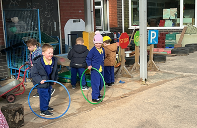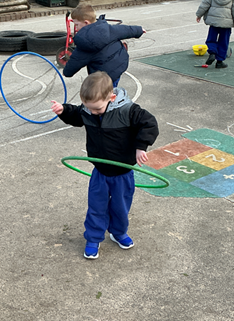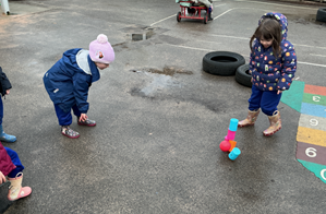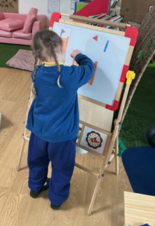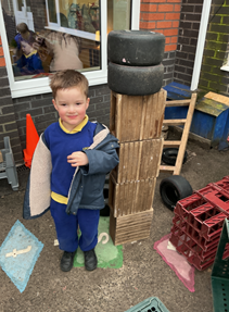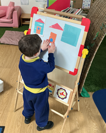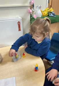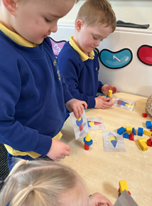 The children built on prior learning, where they explored and built with shapes and objects. They progressed to arranging blocks in chosen positions and gained an awareness of space and where objects will fit or won’t fit. They explored, described and categorised shapes and objects. At this stage, the language used to describe shapes is simple and informal, such as ‘sharp’, ‘pointy’, ‘round’, ‘curvy’ and ‘flat’. Children are not expected to use mathematical names or language but we expose them to it. Within provision, there were a wide range of resources available that encouraged children to use this informal shape vocabulary.
