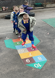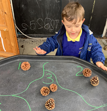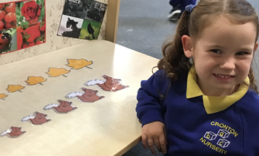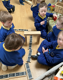 We made and compared collections of objects around the nursery. We explored and built with shapes. We looked at the different blocks, comparing their sizes and   looked at how we could flip and rotate them to fit puzzles. We listened to and joined in with repeats in songs and stories, and we clapped along. We learned about and made line patterns with sequences, and we chose appropriate blocks to build roads and towers. We started singing songs with numbers in them. We sang a range of songs, such as One Potato, Two Potato, 1, 2, 3, 4, 5, Once I Caught a Fish Alive, One, Two, Buckle My Shoe and Here Is the Beehive. We counted on our fingers as we sang, emphasising the order of the numbers and that this order is the same each time. We played games encouraging counting forwards and backwards and made rockets, counting down to them blasting off.