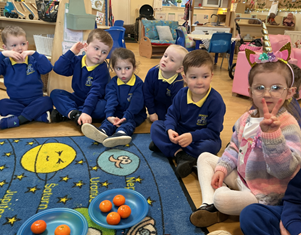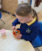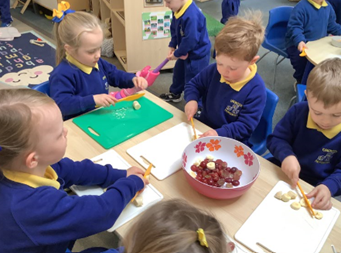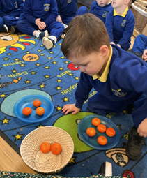 In maths this week, we learned about measures, using mathematical vocabulary and a harvest theme. We ordered things according to size and height.