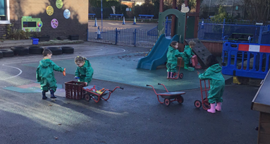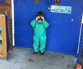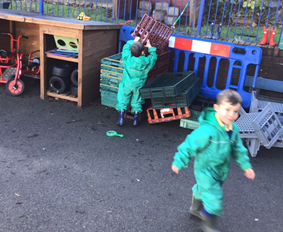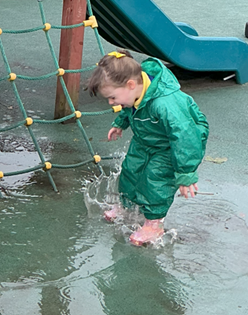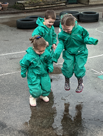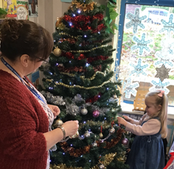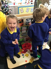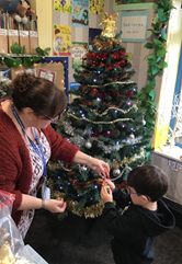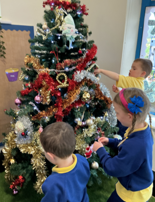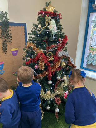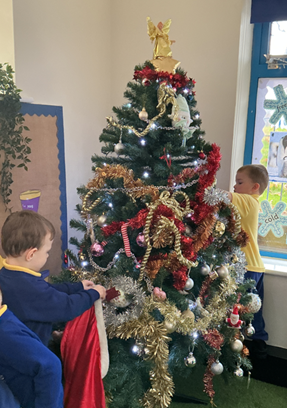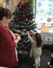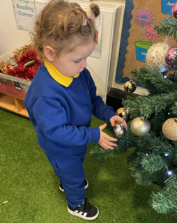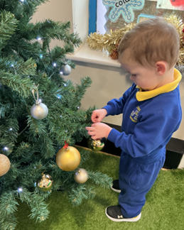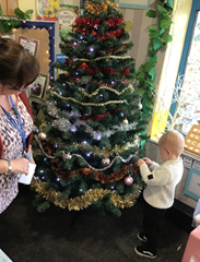 We have put our Christmas tree up in nursery and we all helped Mrs. Wilson to decorate it. We have also been learning to be more independent and put on our own green waterproof suits when we play outside.