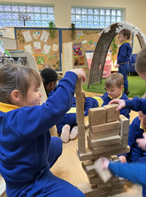 In maths we have been talking about shapes and blocks; how to talk about them and arrange them to make other shapes or structures. We read a book called Let’s Visit London and looked at all the great buildings there. The children then recreated Big Ben and Tower Bridge outside.