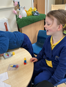 In maths this week, we have been talking about shapes and blocks; how to talk about them and arrange them to make other shapes or structures.