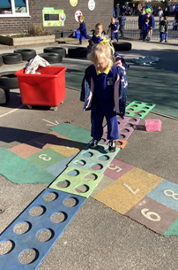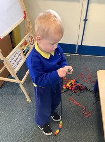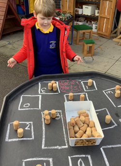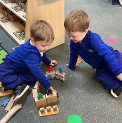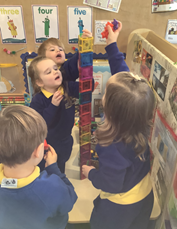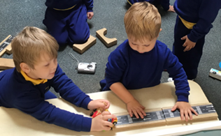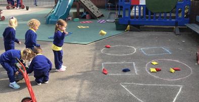 We made and compared collections of objects around the nursery. We explored and built with shapes. We looked at the different blocks, comparing their sizes and looked at how we could flip and rotate them to fit puzzles. We listened to and joined in with repeats in songs and stories, and we clapped along. We learned about and made line patterns with sequences, and we chose appropriate blocks to build roads and towers. We started singing songs with numbers in them. We sang a range of songs, such as One Potato, Two Potato, 1, 2, 3, 4, 5, Once I Caught a Fish Alive, One, Two, Buckle My Shoe and Here Is the Beehive. We counted on our fingers as we sang, emphasising the order of the numbers and that this order is the same each time. We played games encouraging counting forwards and backwards and made rockets, counting down to them blasting off.