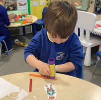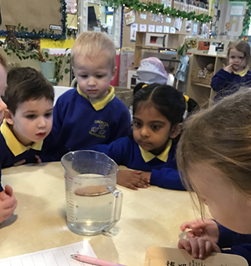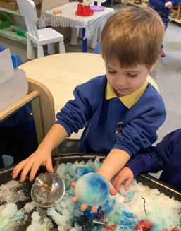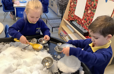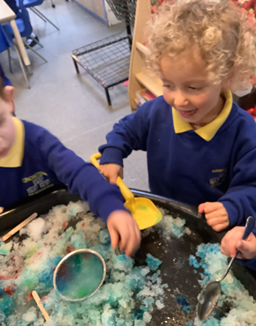 It was too cold to go outside, so we brought the snow inside instead! The children loved playing with it and exploring what happened when  we added food colouring and glitter. They watched as it melted and we talked about why. A perfect start to our Science Week.