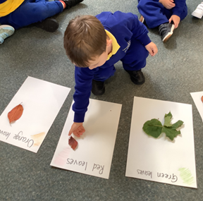 In Maths Time, we ordered pictures from smallest to largest, by looking for the smallest one each time.  We also sorted autumn leaves – looking at sizes and colours