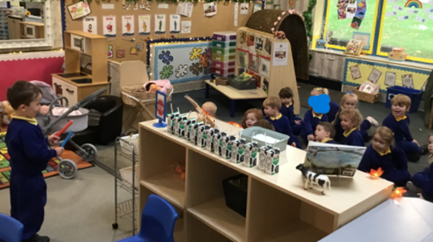 In maths we looked at where to place blocks to tell a story, fitting objects into the right sized containers and we made the three pigs houses out of shapes.