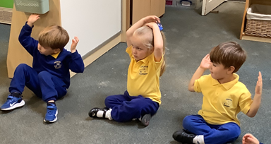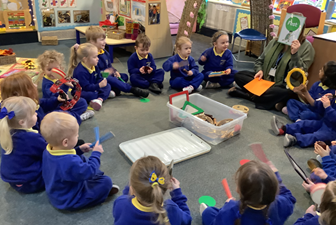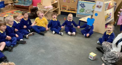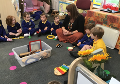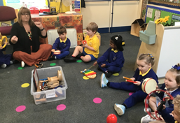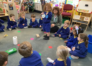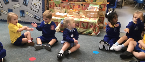 Practising good sitting and listening, while learning about Autumn. Listening carefully to distinguish between different environmental sounds and different musical instrument sounds. Composing and following our own 3 beat body percussion. Singing traditional nursery rhymes.