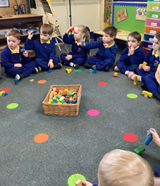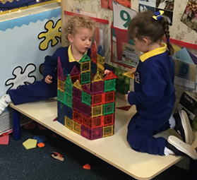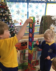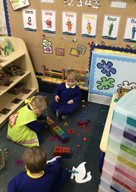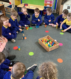 This week in Maths, we have explored position and space; responding to simple positional language and arranging blocks. We have sung songs, re-enacted a story with blocks and made buildings with the blocks, by following pictures. We played Incy Wincy Spider and practised our subitising and counting skills.