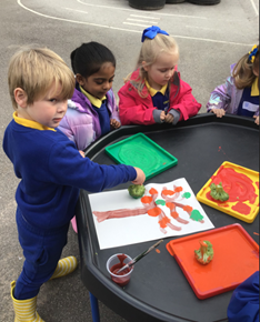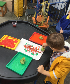 Painting autumn trees with broccoli, using the balances to weigh our autumn materials, making obstacle courses to practise balancing, and lots more fun.