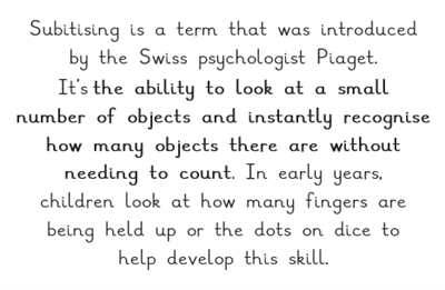 In maths we have been singing songs and reading stories, about numbers 1, 2 and 3. Subitising / recognising when there are 1, 2 or 3 objects.