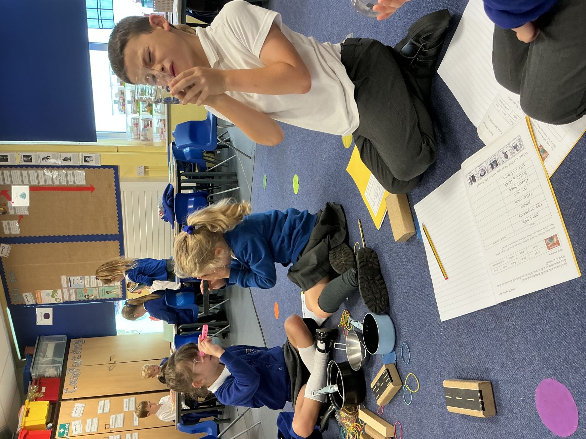 In science we investigated which materials we could change by squashing, squeezing, stretching and twisting. We investigated blu tack, wood, plastic and paper. After we had made our predictions we got testing!