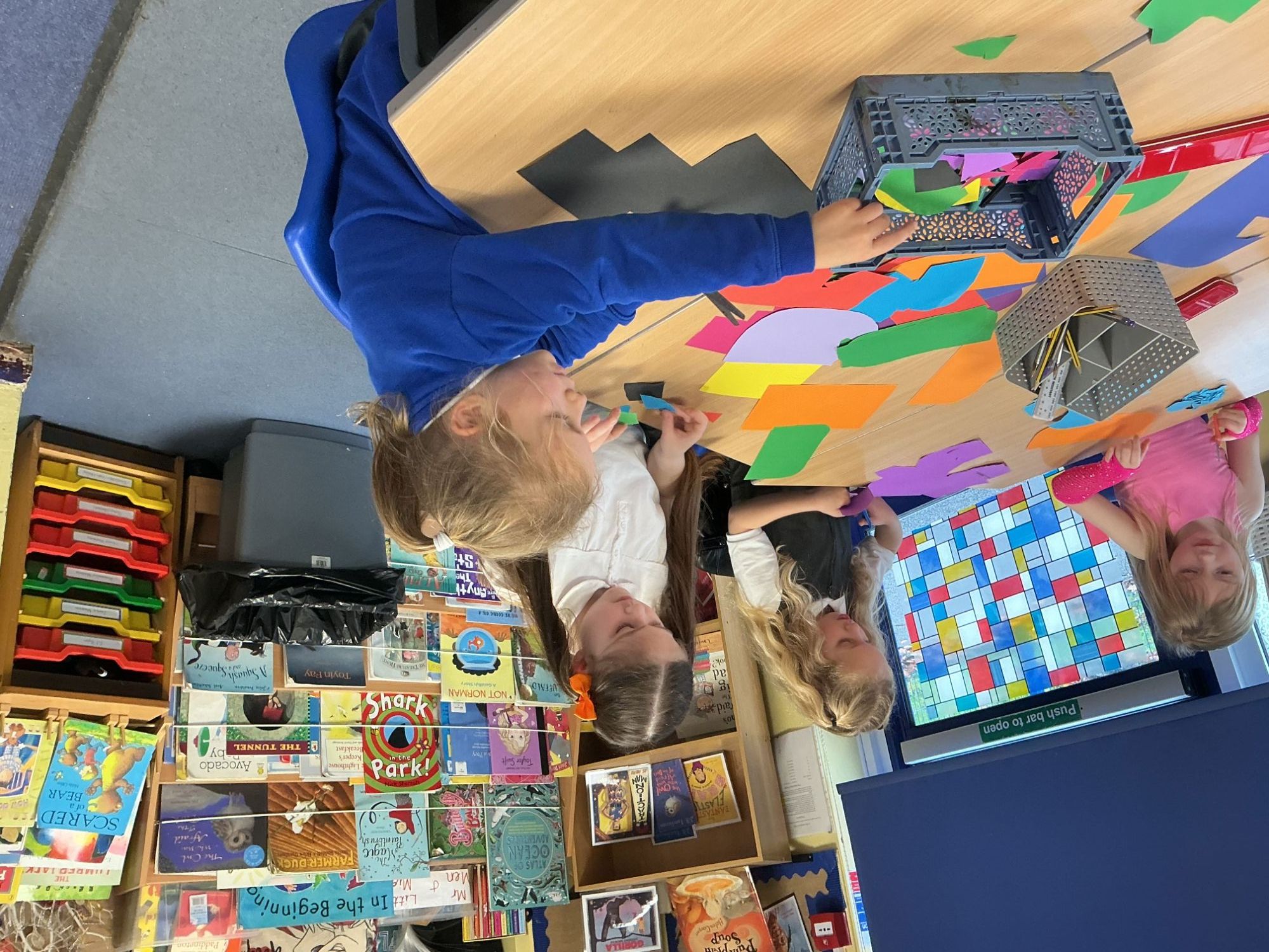 In art and design this week, we learned a simple weaving technique using paper looms and strips of paper. They made a great pattern!