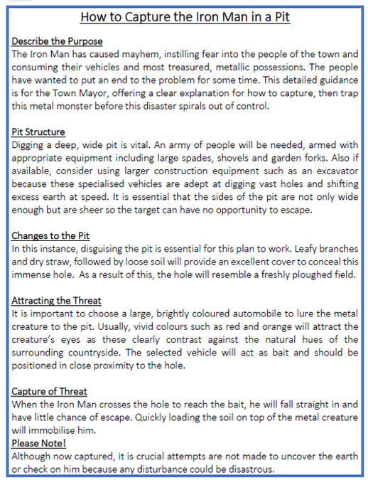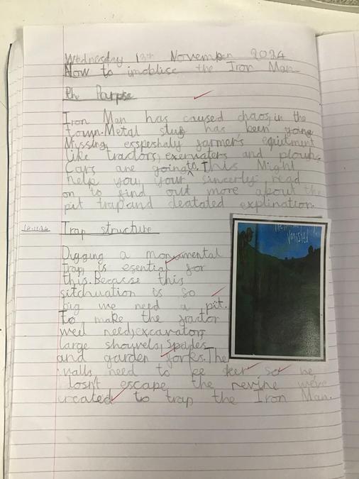 In English, we have been writing a detailed plan for the town mayor so we can capture the Iron Man. This will stop him from causing mayhem in the town! Take a peek at some of our writing: