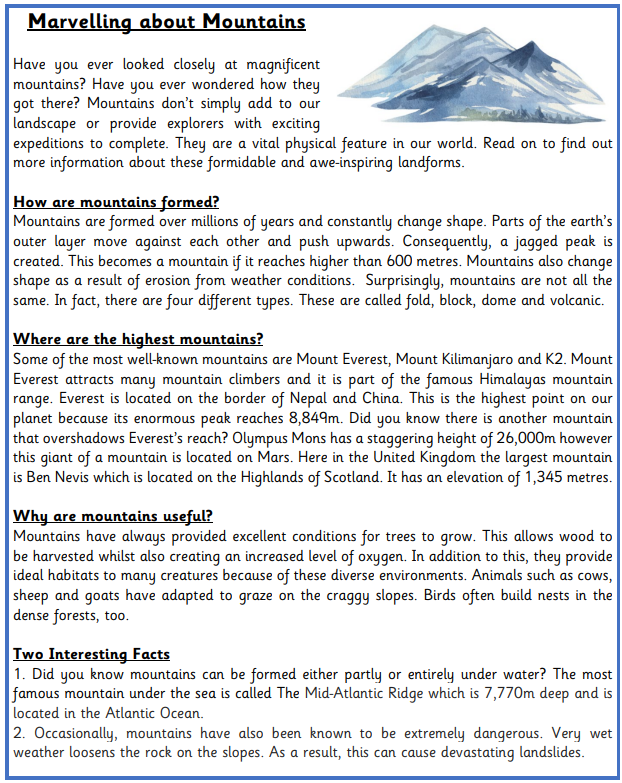 In geography, we have started our new topic about mountains. The children have begun to explore how mountains are formed and where some of the most famous mountain ranges in the world can be found. In history, we have begun learning about the Cradles of Civilisation. This week the children leant about clay tablets and the first forms of writing used in ancient Mesopotamia.