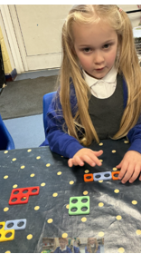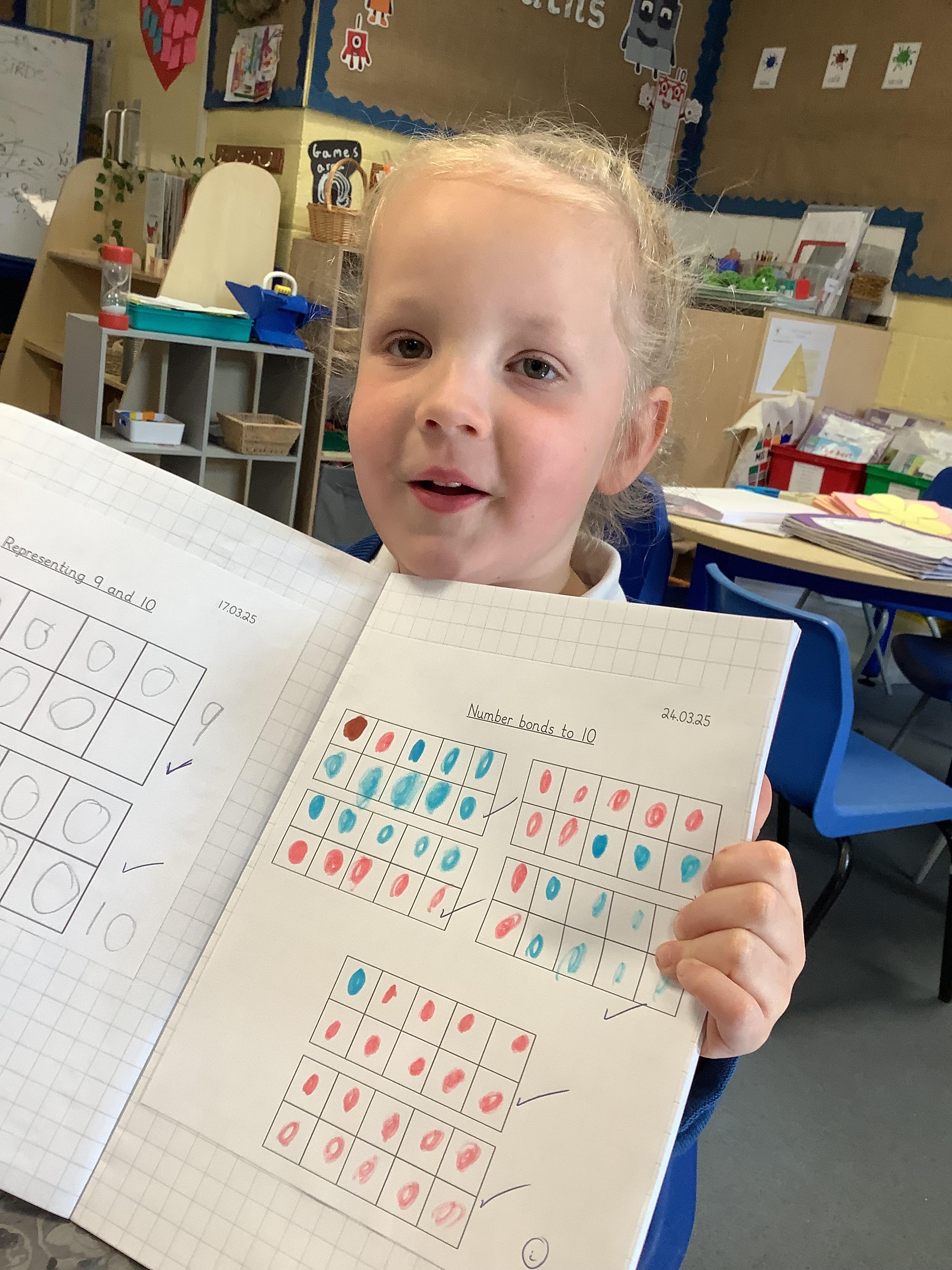 In Maths, we have been learning number bonds to 10 e.g. 1 and 9, 2 and 8, 3 and 7 etc. We used counters and different objects to explore the different number bonds by making arrangements in two groups.