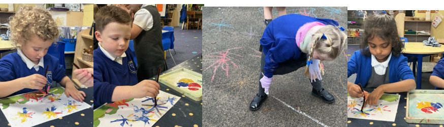 This week, we explored the festival of Bonfire Night. We learnt about why it is celebrated and how people mark the occasion with fireworks, bonfires, and gatherings. The children created vibrant firework art using pipe cleaners dipped in paint, experimenting with colour and shape. Outside, we worked collaboratively to make large-scale firework displays using chalks on the playground, developing our gross motor skills and creativity.