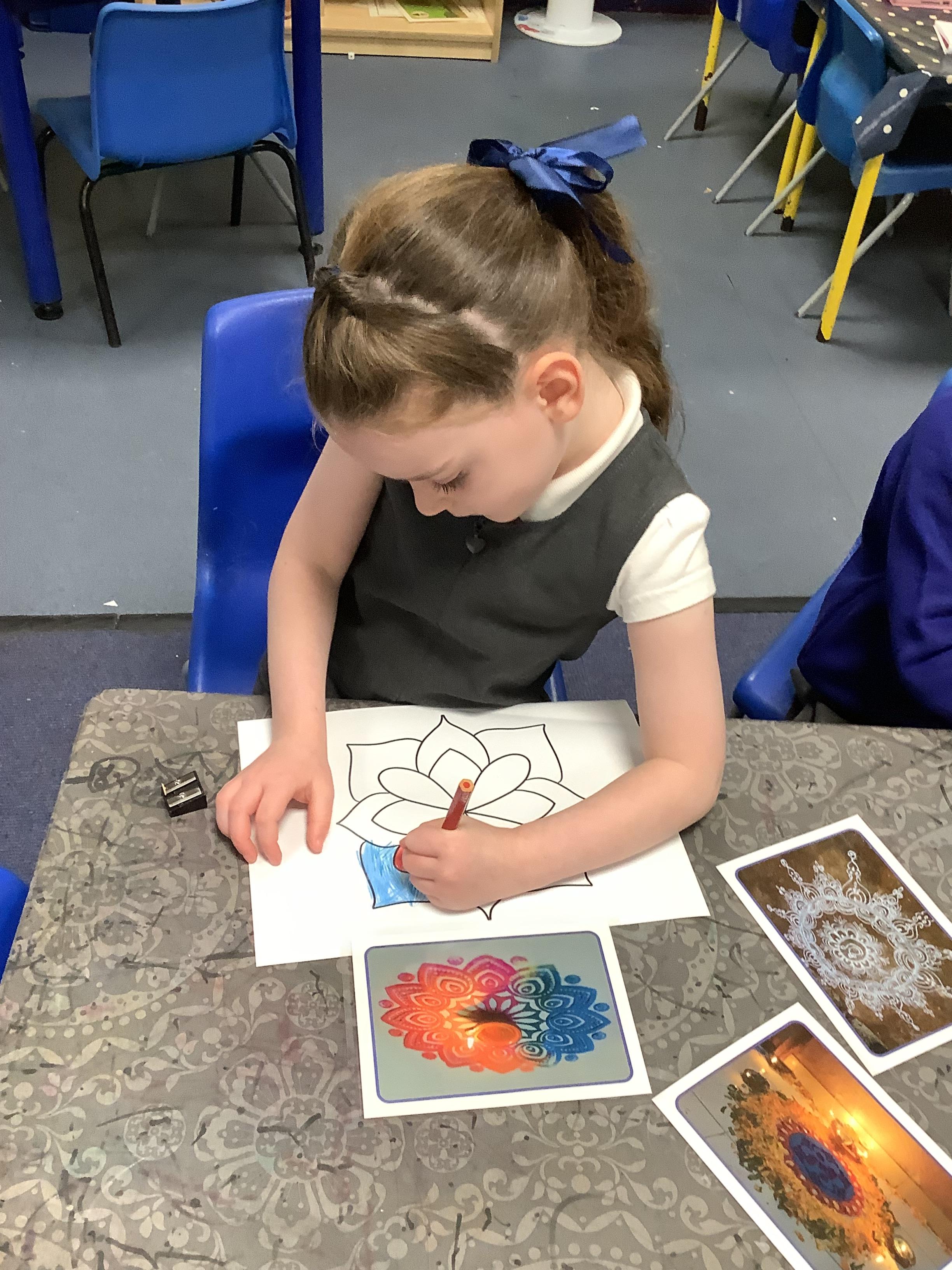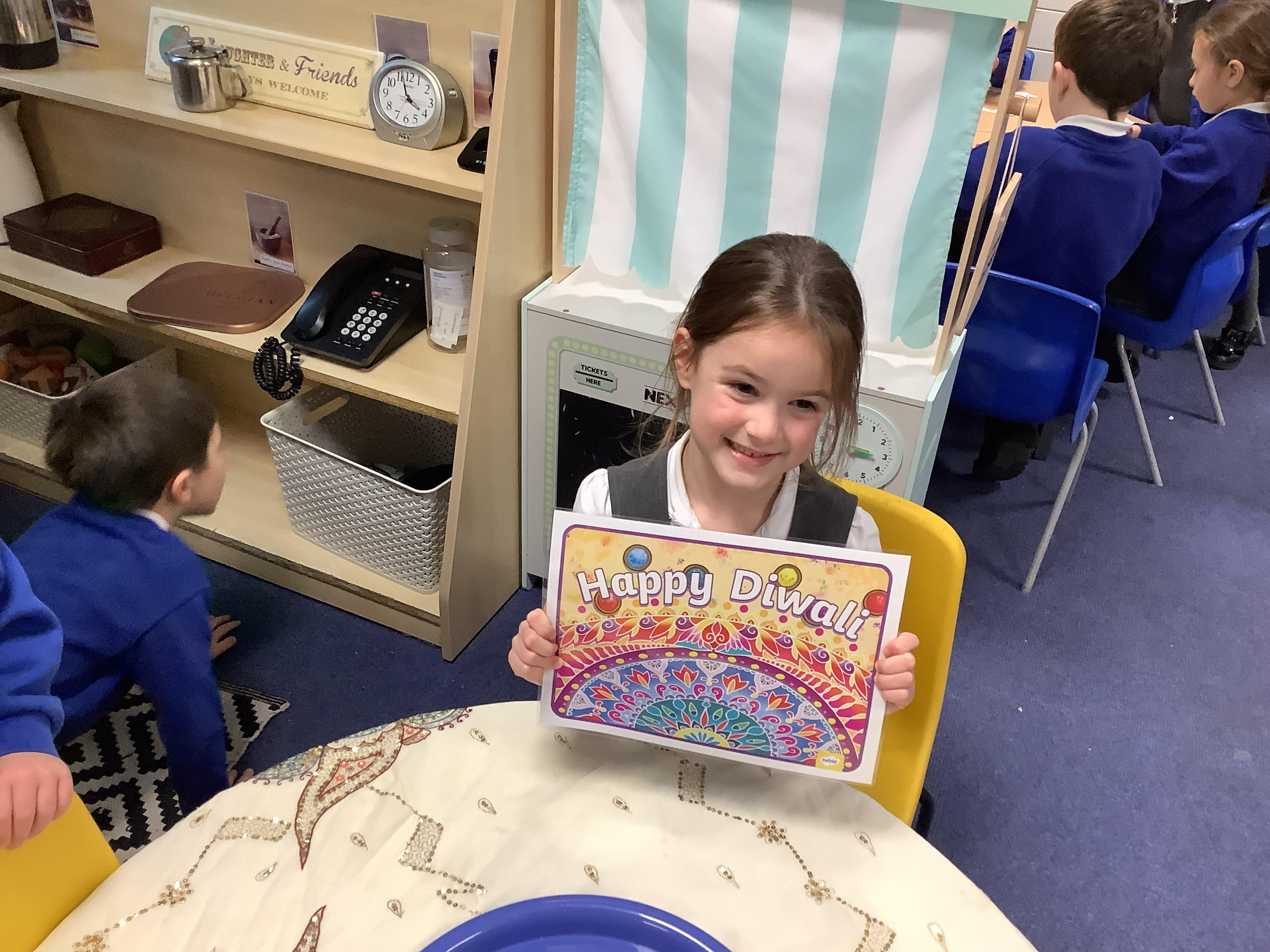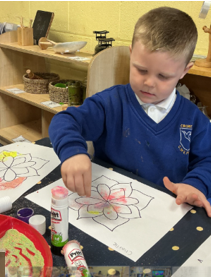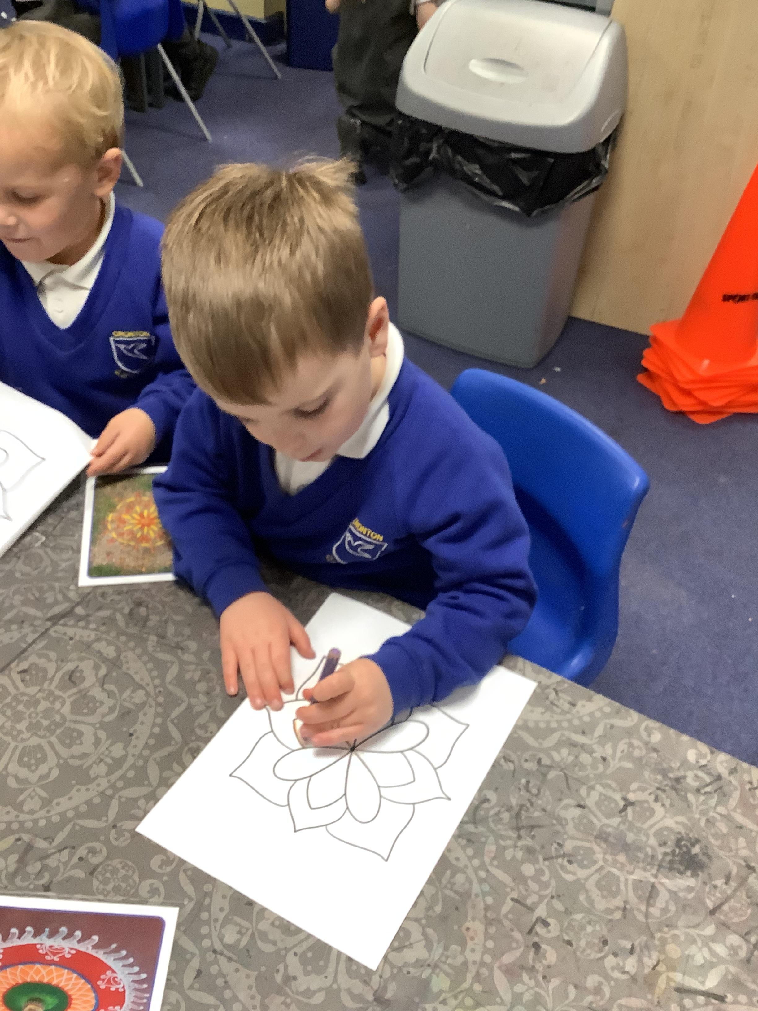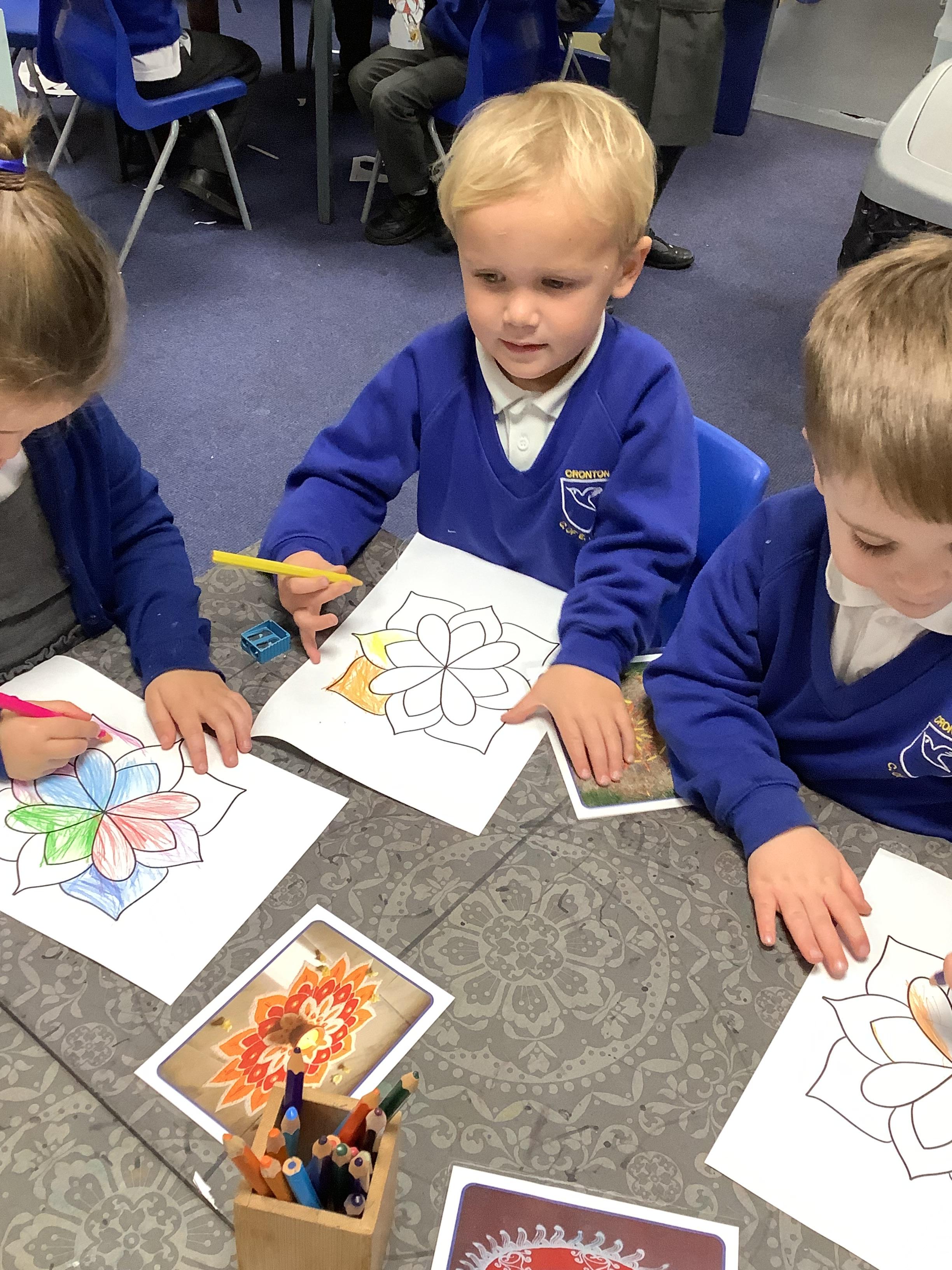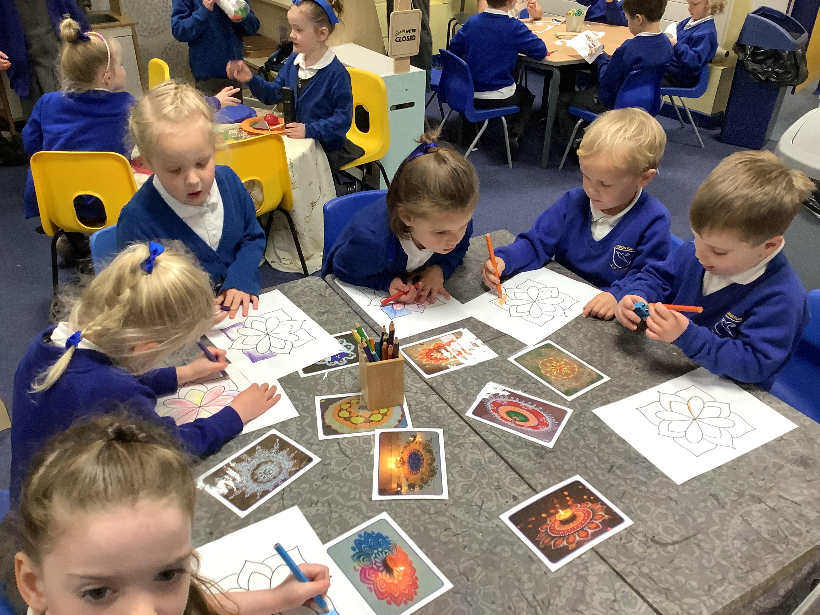 We had a wonderful time today learning about the Hindu Festival of Diwali. – the Festival of Light. We made cards, created our own rangoli patterns, danced and enjoyed listening to the story of Rama and Sita. We also got together with our Gardeners to make rangoli candle holders.