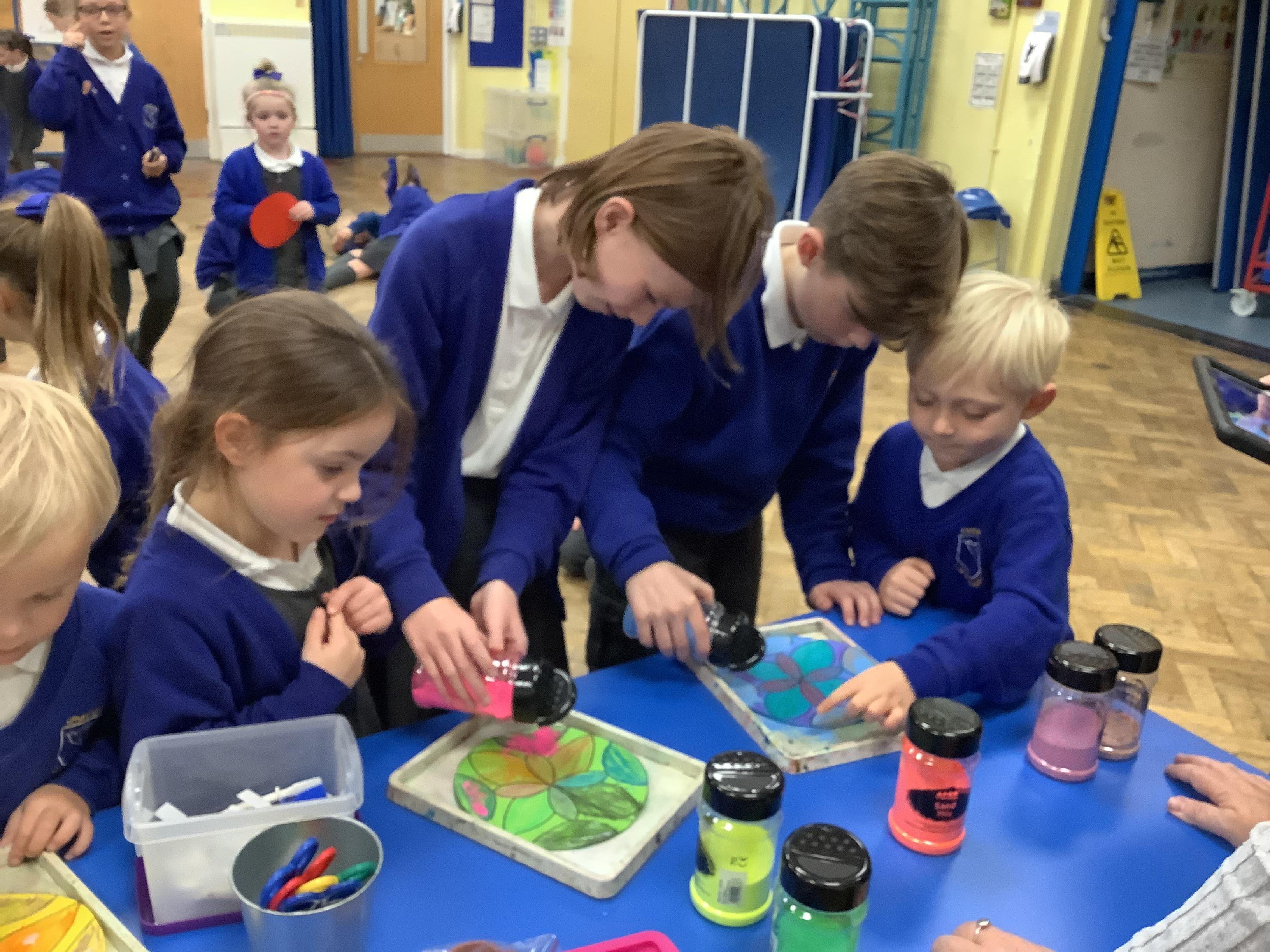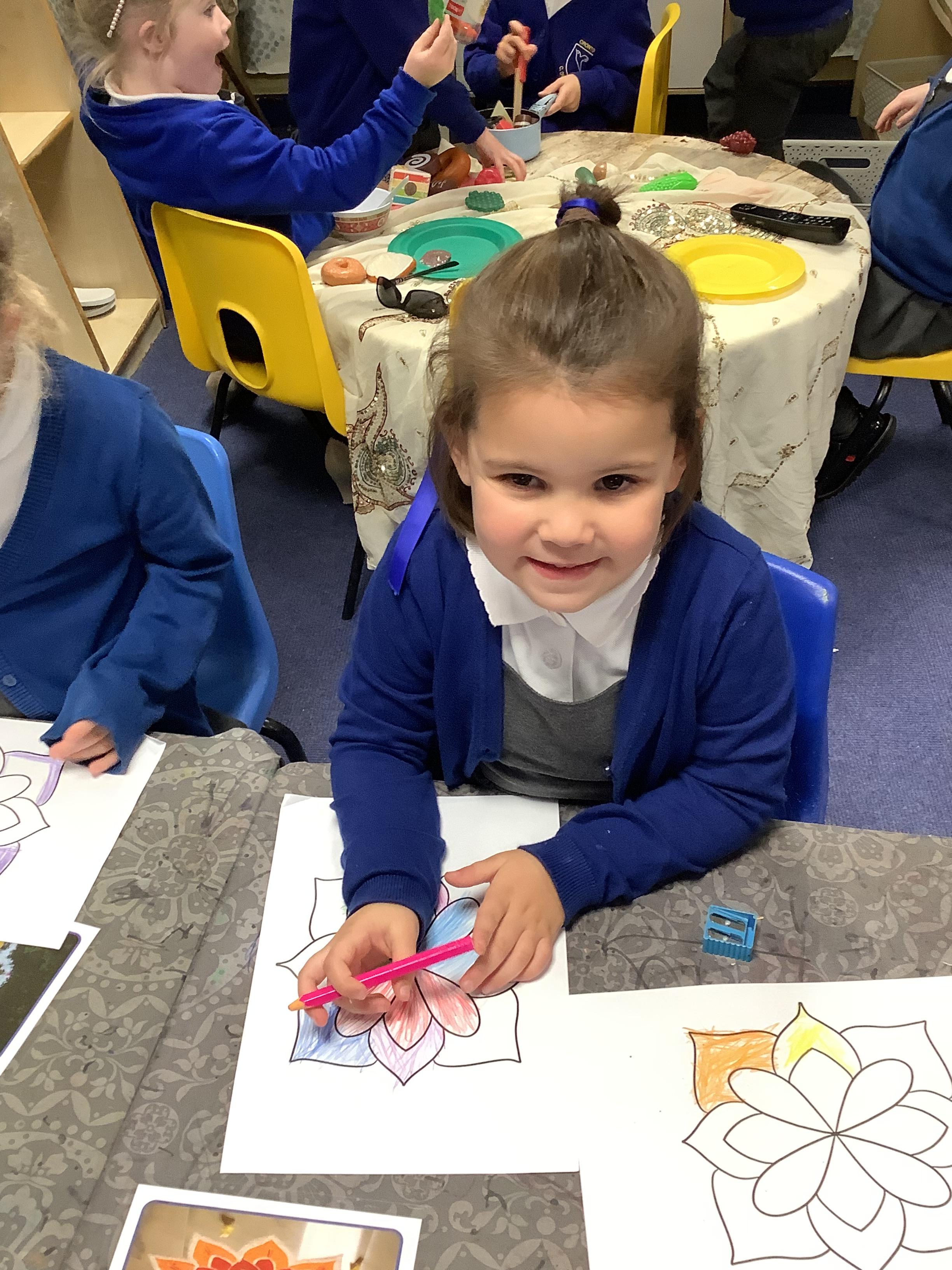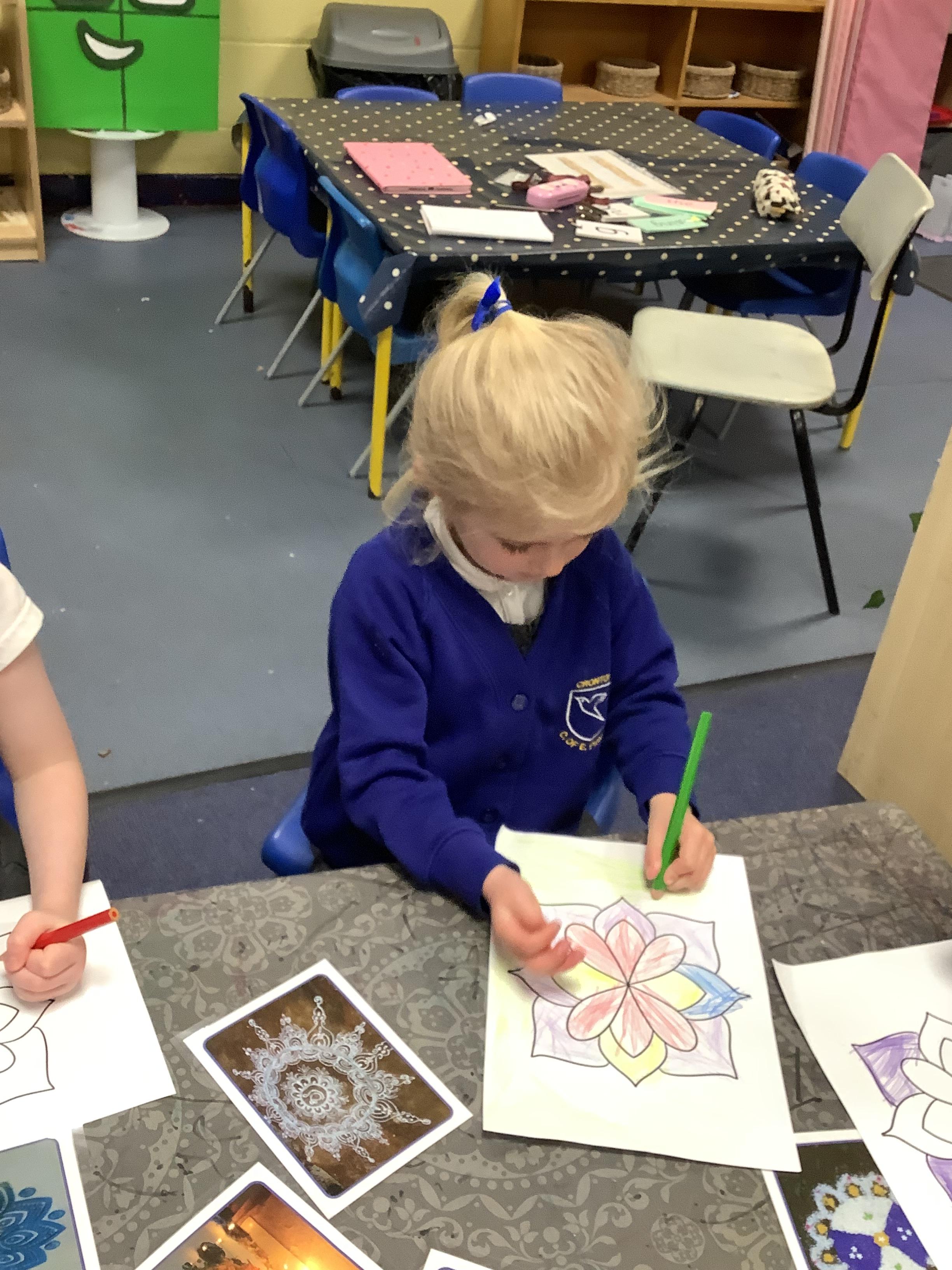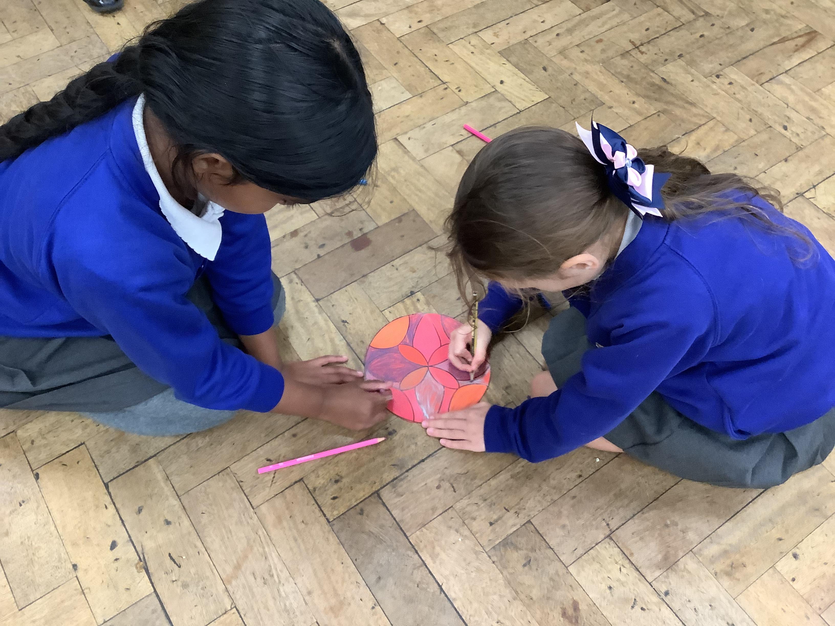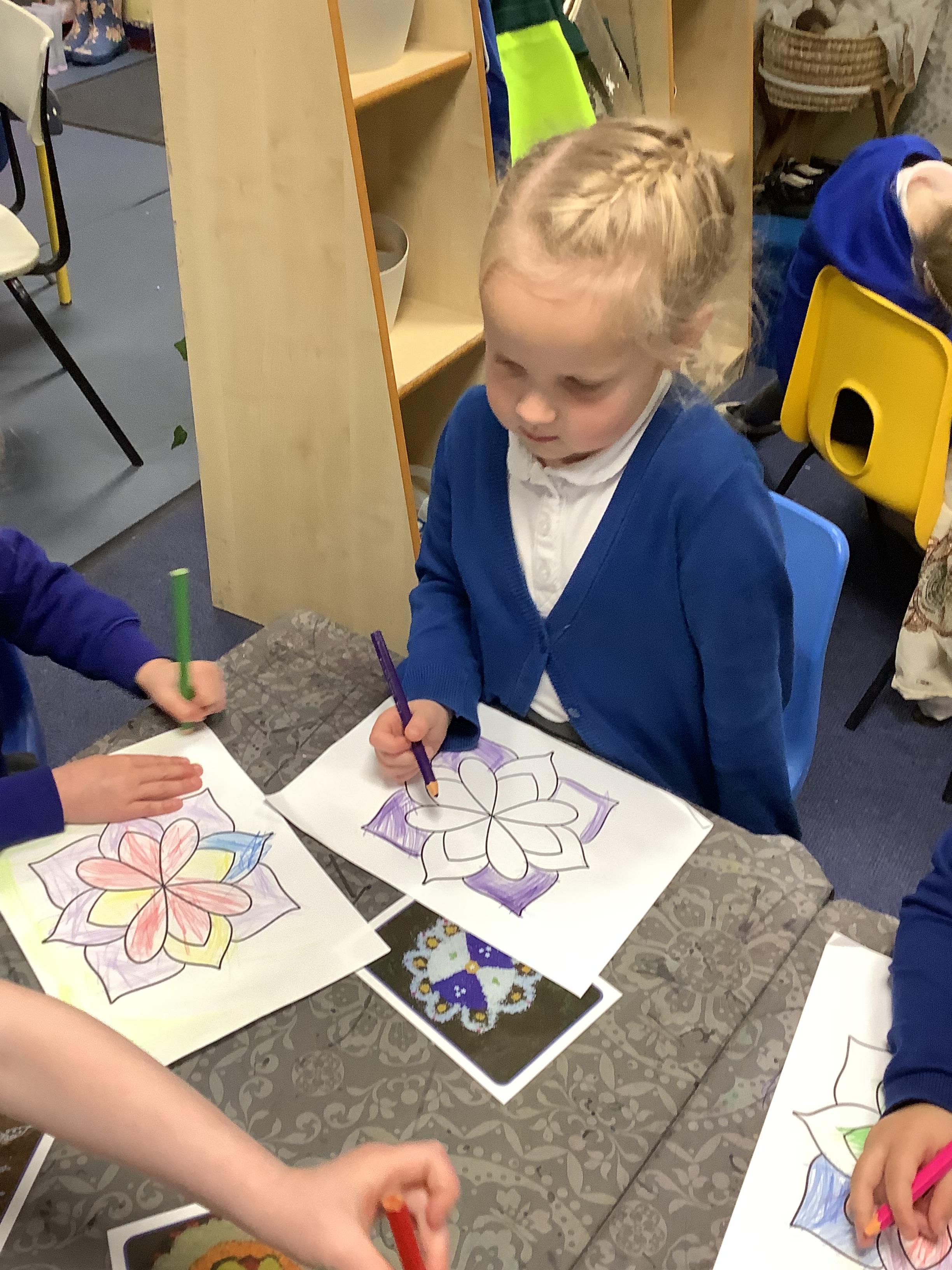 We had a wonderful time today learning about the Hindu Festival of Diwali. – the Festival of Light. We made cards, created our own rangoli patterns, danced and enjoyed listening to the story of Rama and Sita. We also got together with our Gardeners to make rangoli candle holders.