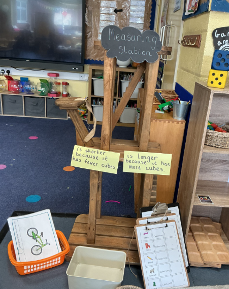 This week in Maths we have been comparing objects using size vocabulary such as long, short, longer, shorter, longest, and shortest. The children explored these concepts through lots of hands‑on activities, including using cubes to measure different classroom objects. They enjoyed predicting which items would be longer or shorter and then checking their ideas using cubes as non‑standard units of measurement.