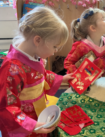 Reception have loved learning about Chinese New Year and exploring the different ways the festival is celebrated. The children learned about traditions such as lanterns, dragon dances and family feasts, and they were especially excited to make their own colourful Chinese lanterns with support from their Year 5 Gardeners. To deepen their understanding through play, we have also enhanced our home corner with Chinese decorations, utensils and role‑play resources, giving the children opportunities to recreate celebrations, share food, dress up and immerse themselves in the festivities.