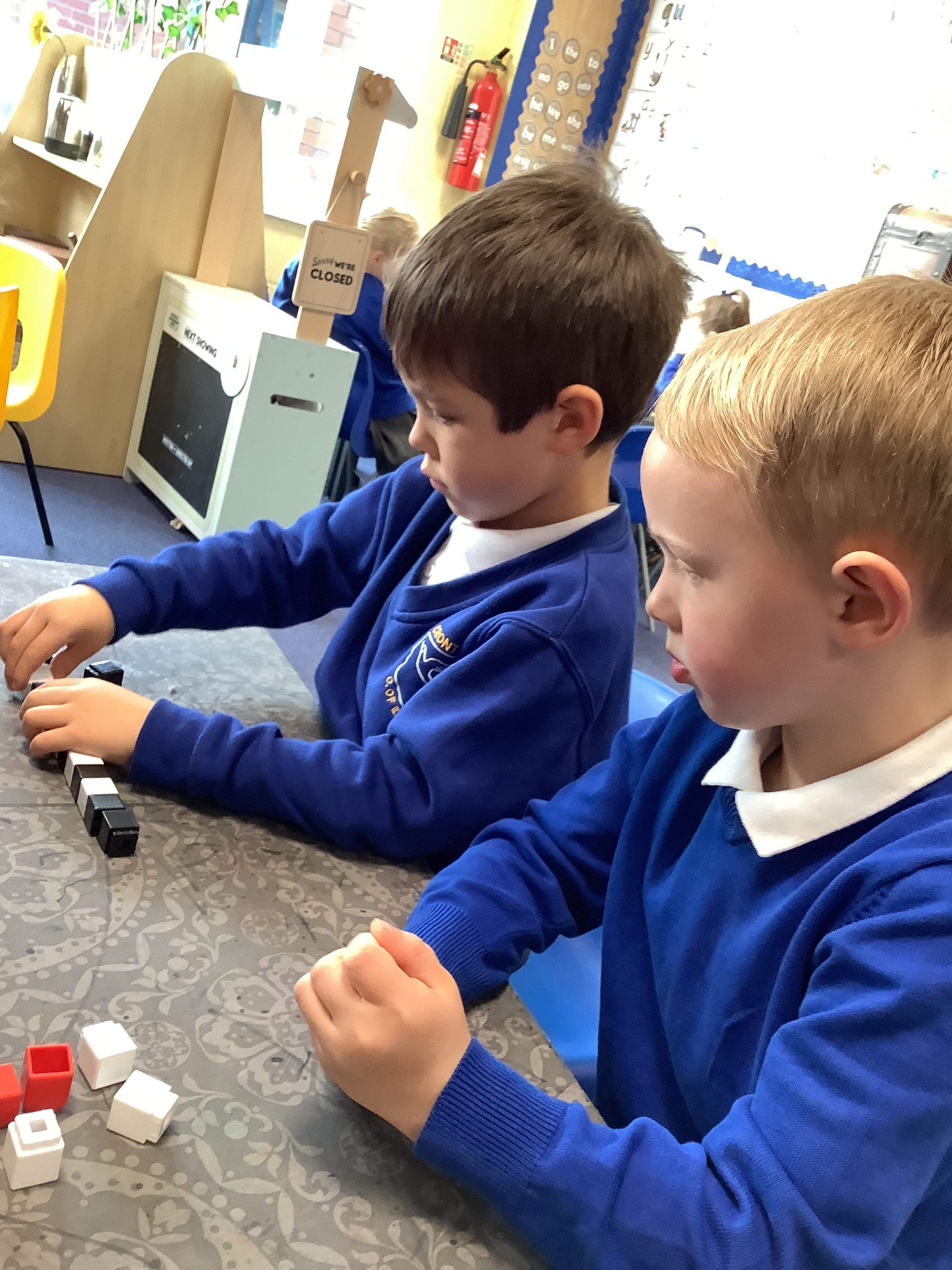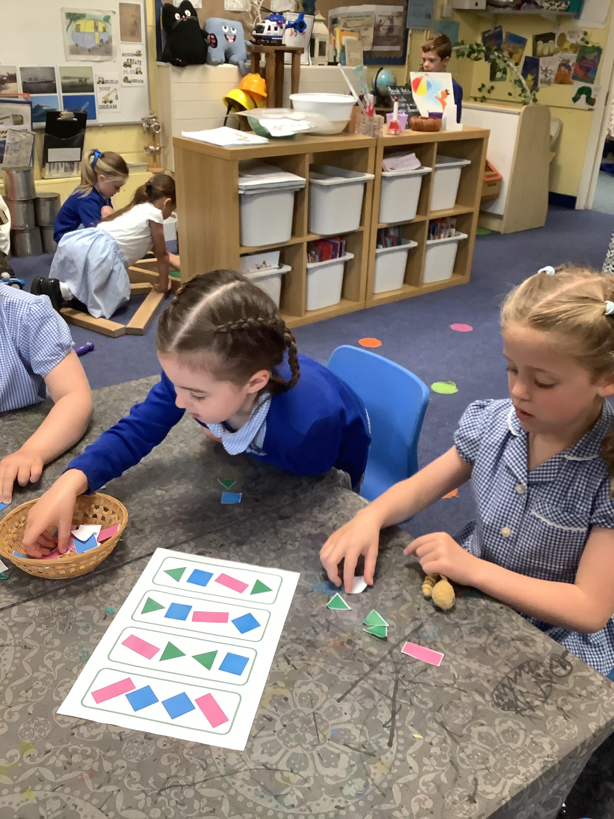 In Maths, we have been learning to identify and recreate repeating patterns. We used lots of different resources to make our own repeating patterns.