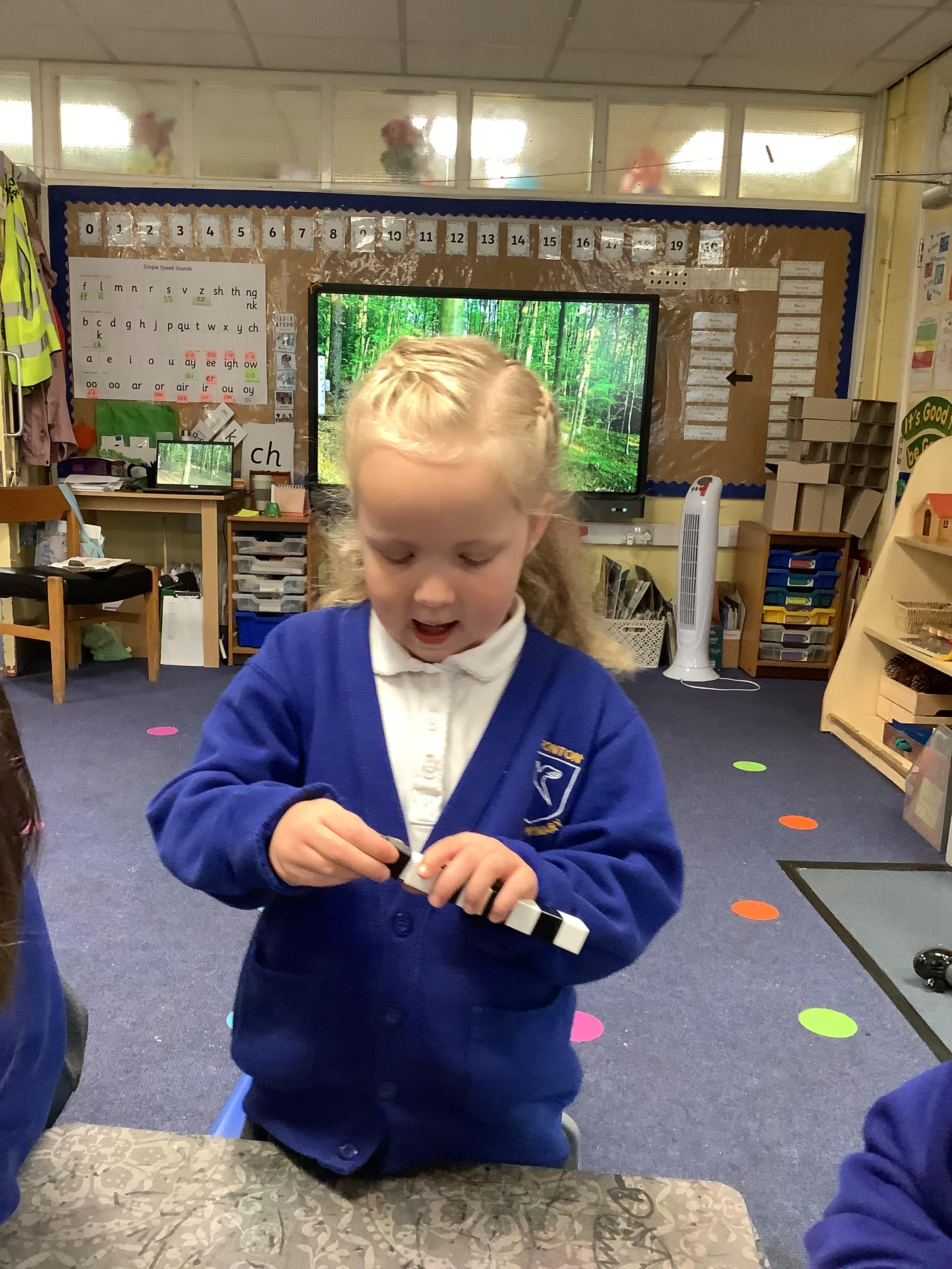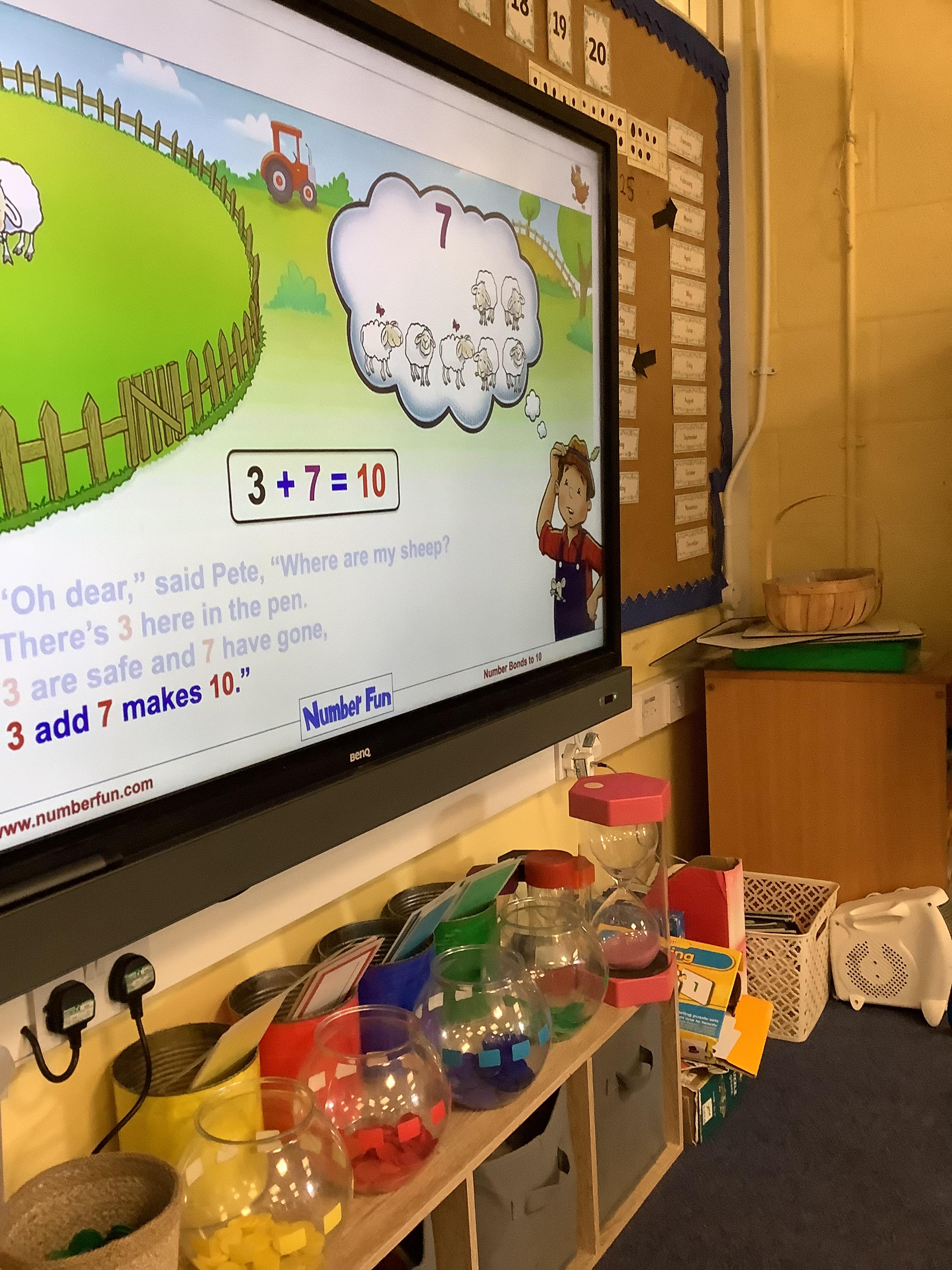 In Maths, we consolidated our learning of number bonds to 10. We used the large ten frame and counters, a large part whole model with cubes and Numicon to support our understanding. We also enjoyed singing ‘Farmer Pete’s’ Number bond song.