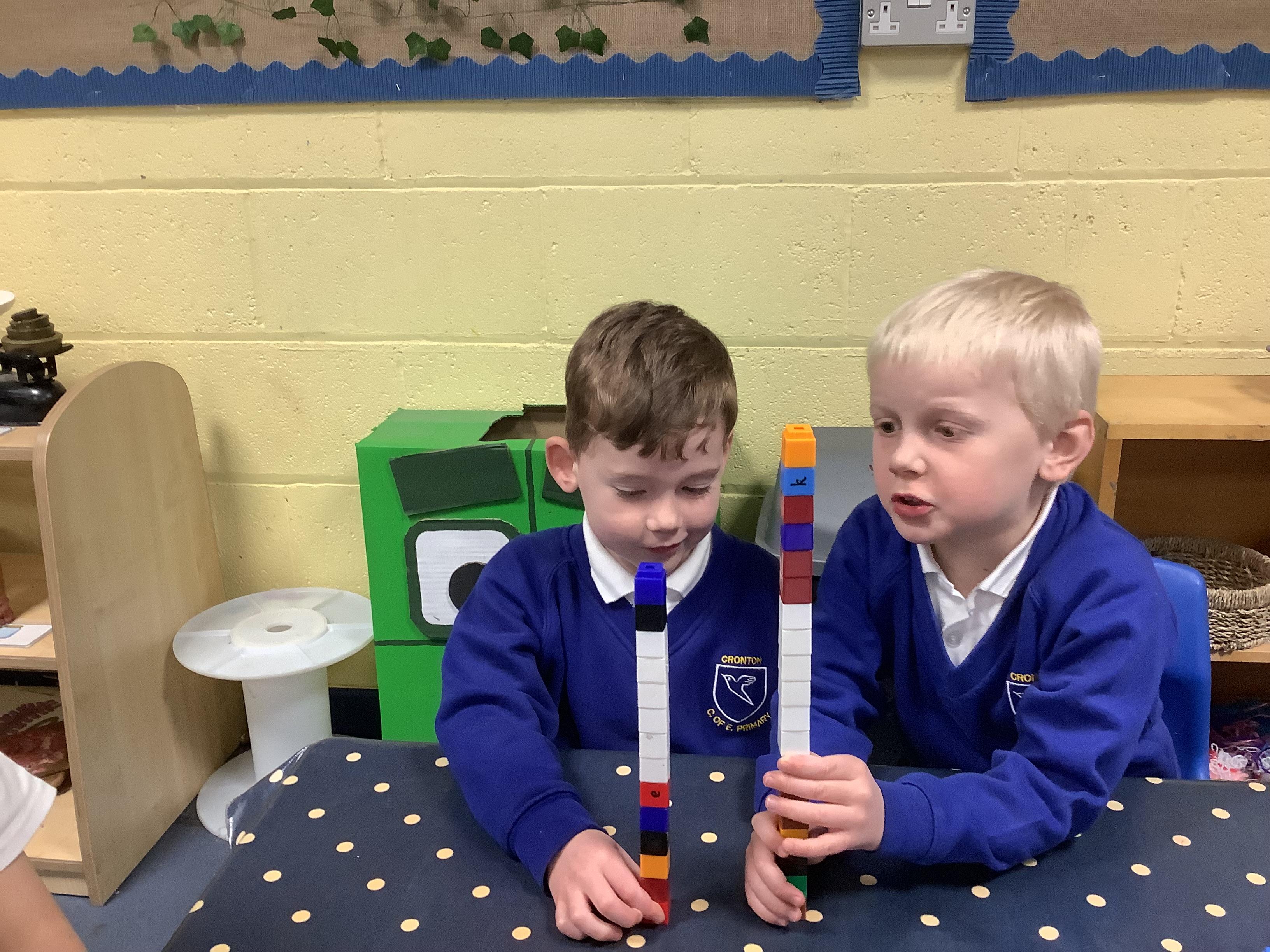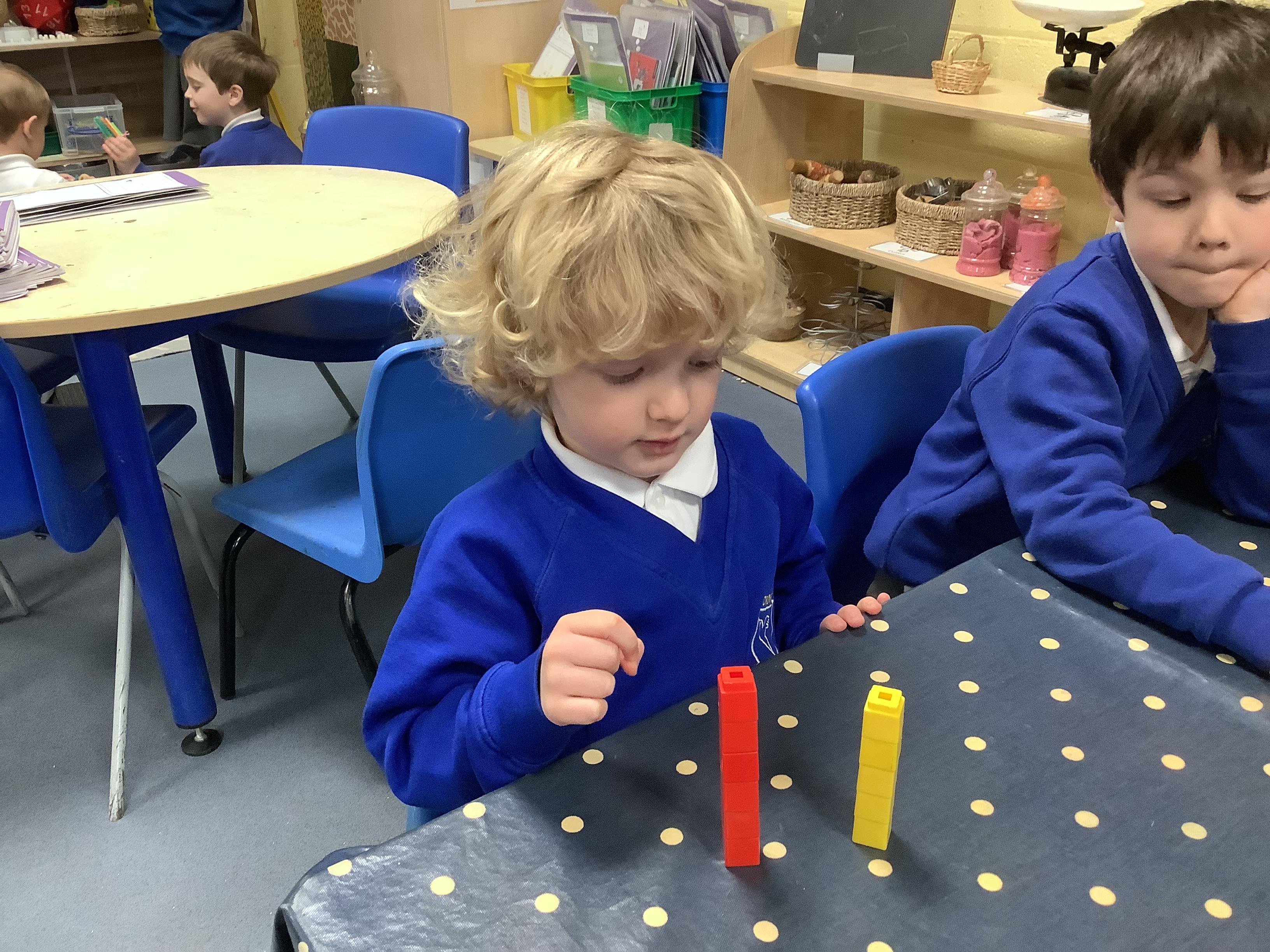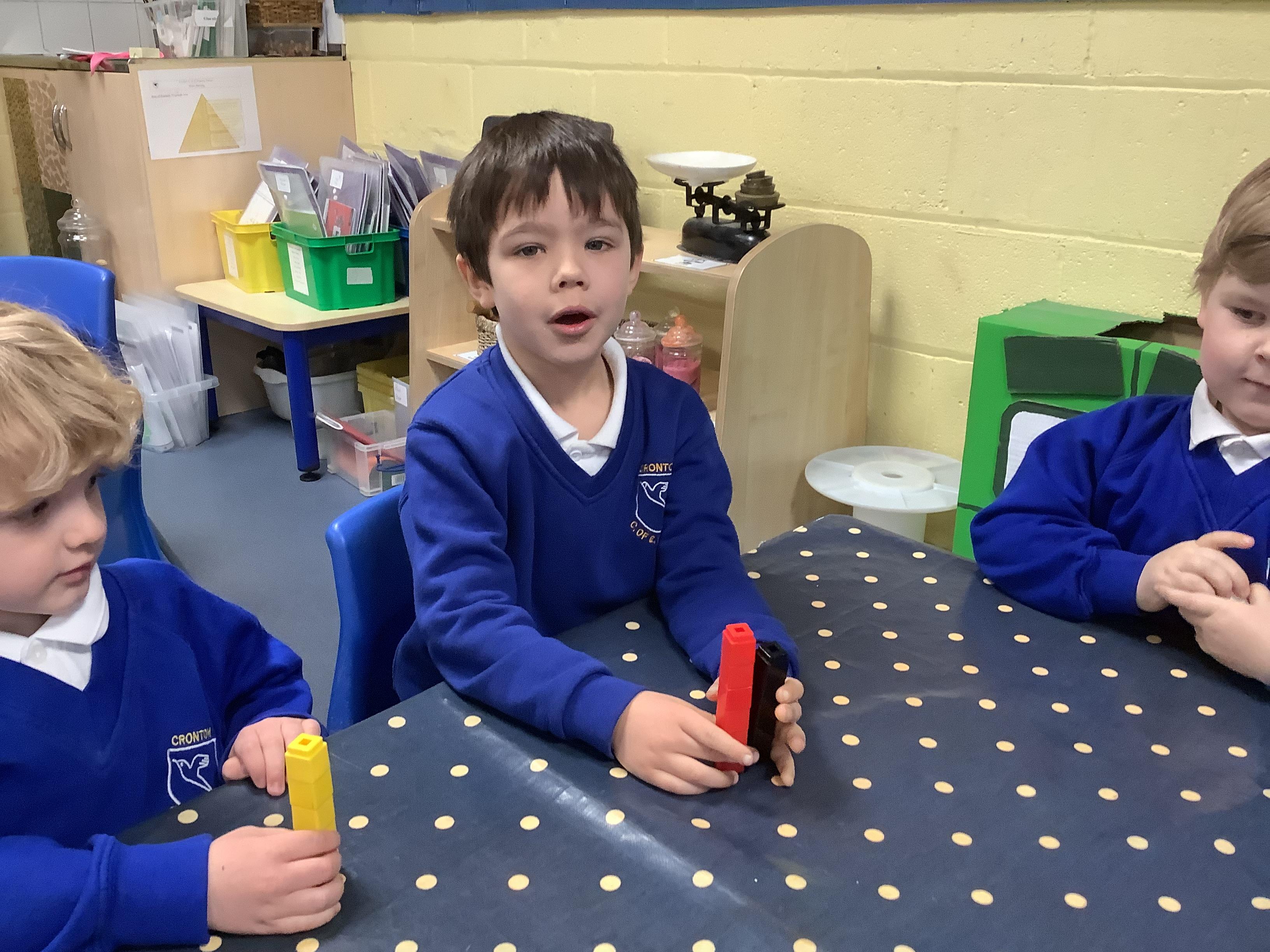 In Maths, we have been learning to explore and compare length and height. We used size vocabulary to compare towers, we used cubes to measure the length of Superhero footprints and we ordered the superheroes by their size.