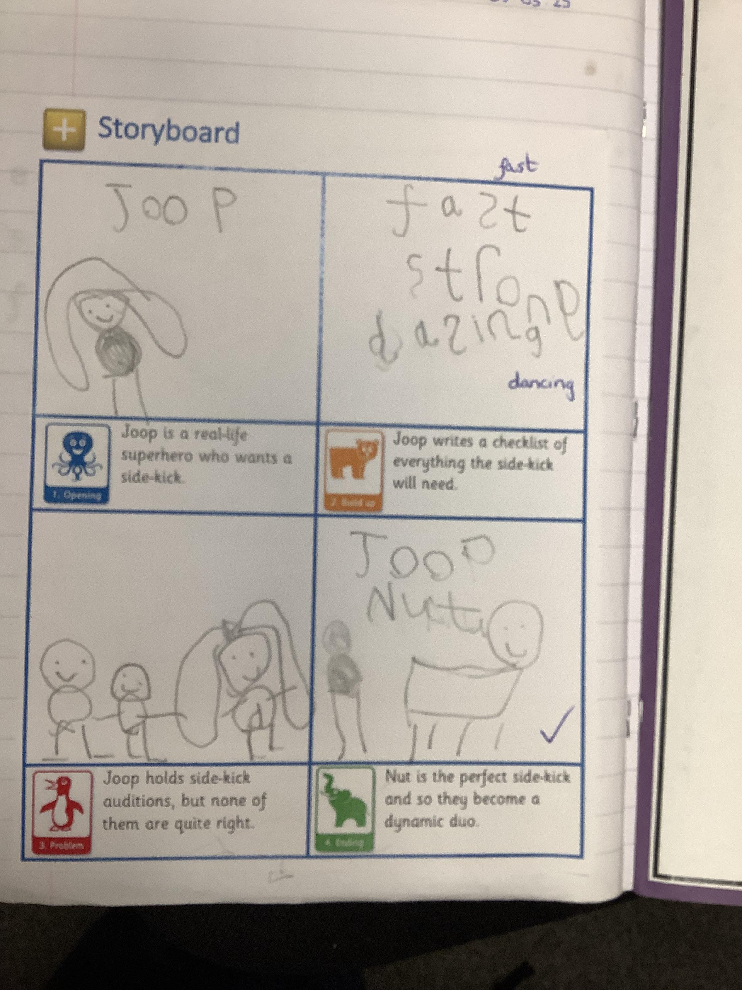 This week in Literacy, we have been drawing storyboards to show our knowledge of the parts of the story of Juniper Jupiter. Within our lessons, we use an example text, which is a simplified version of the story, to support our storytelling. In our sentence writing we wrote about Joop and her super powers.
