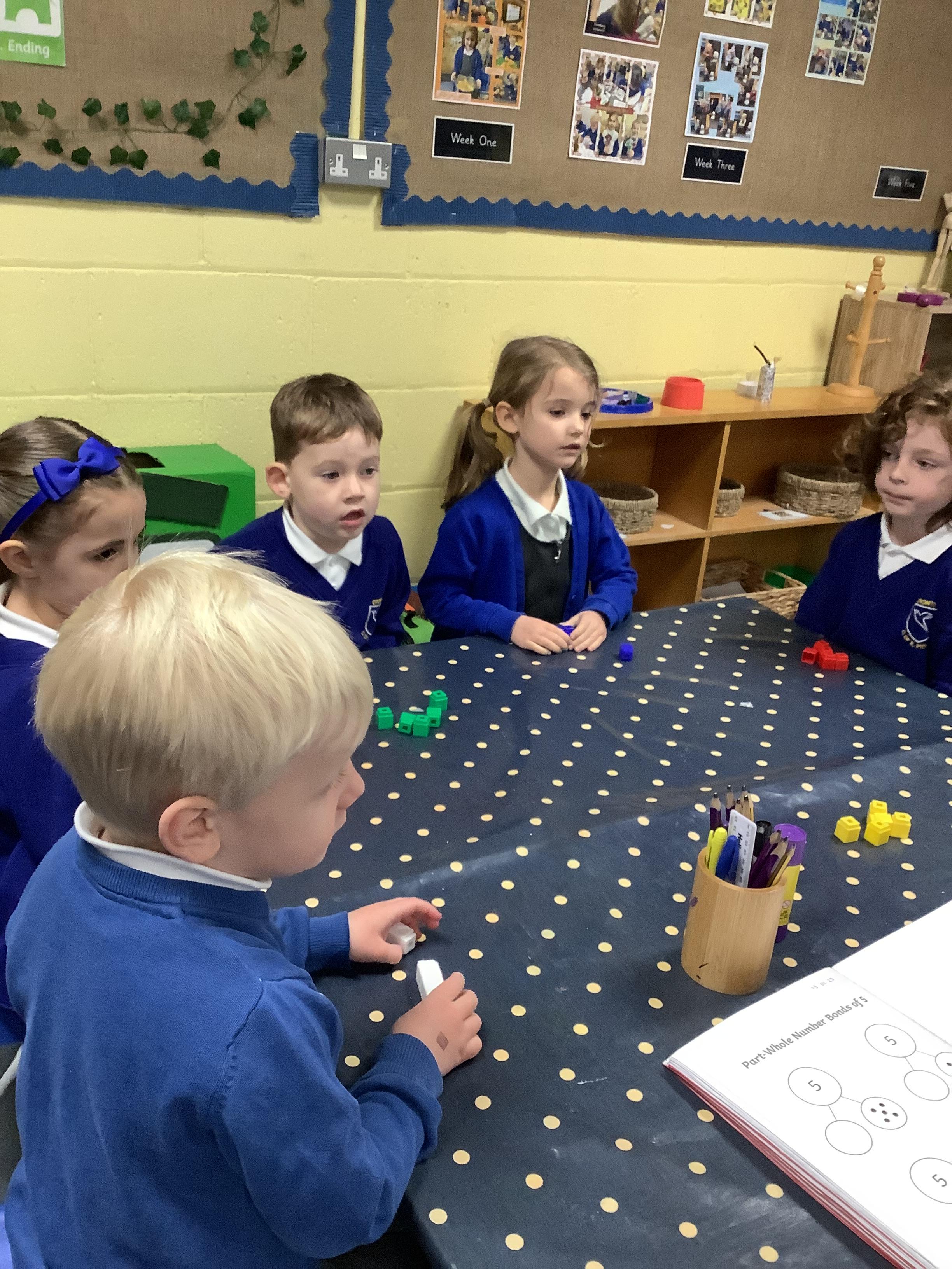 In Maths, we have been learning about number bonds to 5. The children have used cubes and numicon to explore the numbers that always go together to make 5. The children are becoming increasingly confident at recalling the number bonds and they used their knowledge to solve missing number problems.