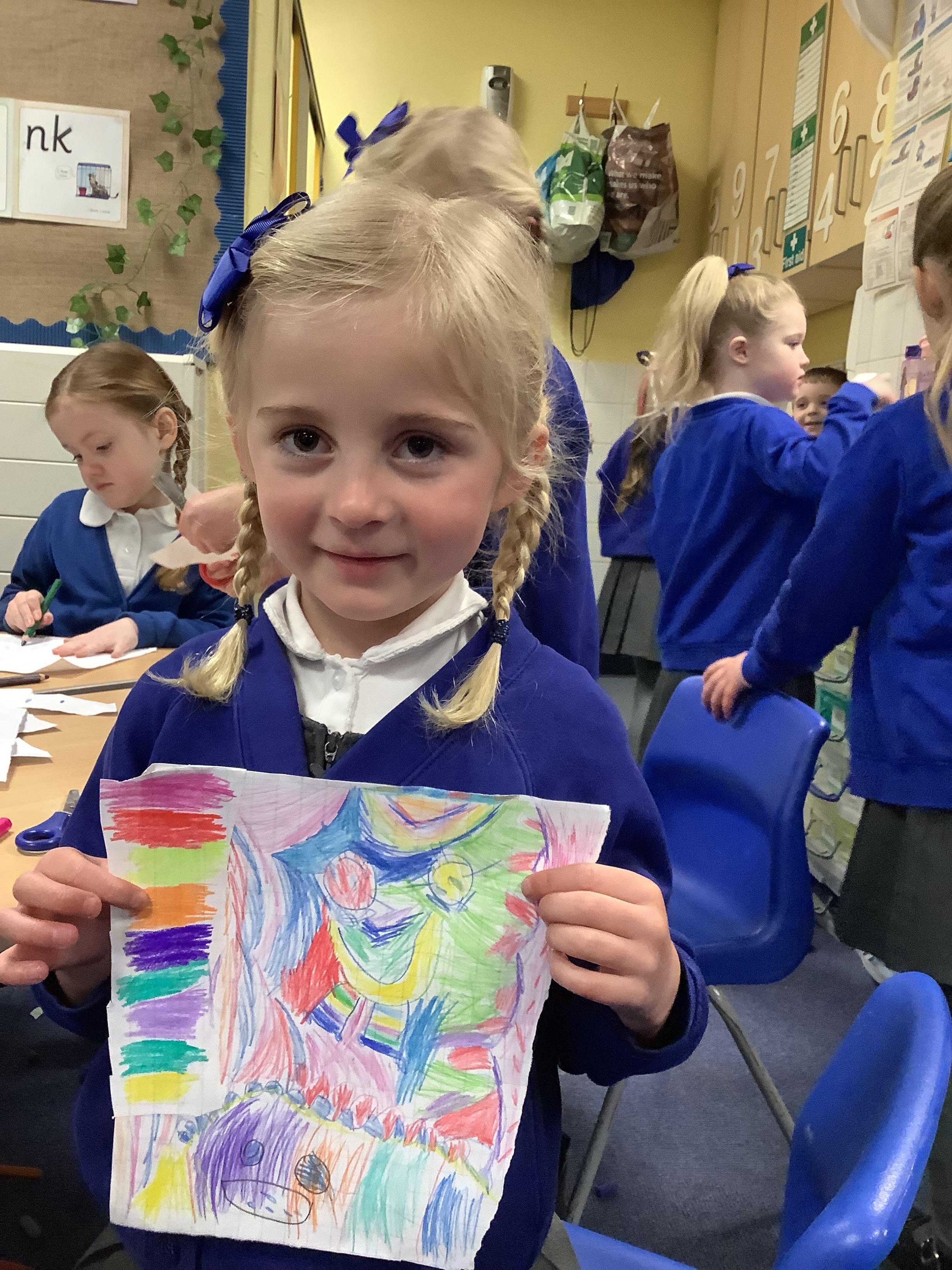 In Expressive Arts and Design, we have been drawing self-portraits. We looked in the mirror to notice our features and then drew our faces and coloured them in using true colours.
