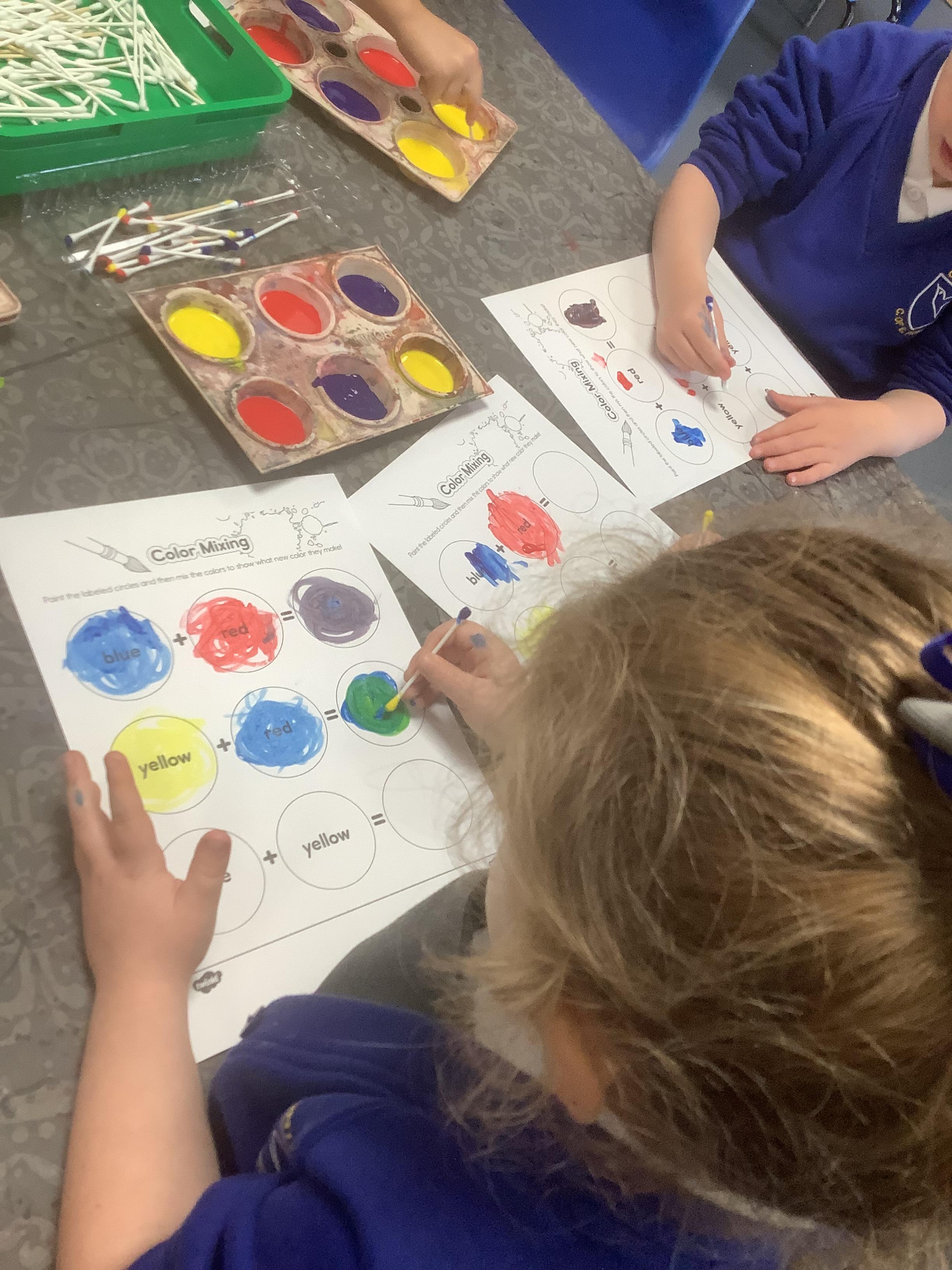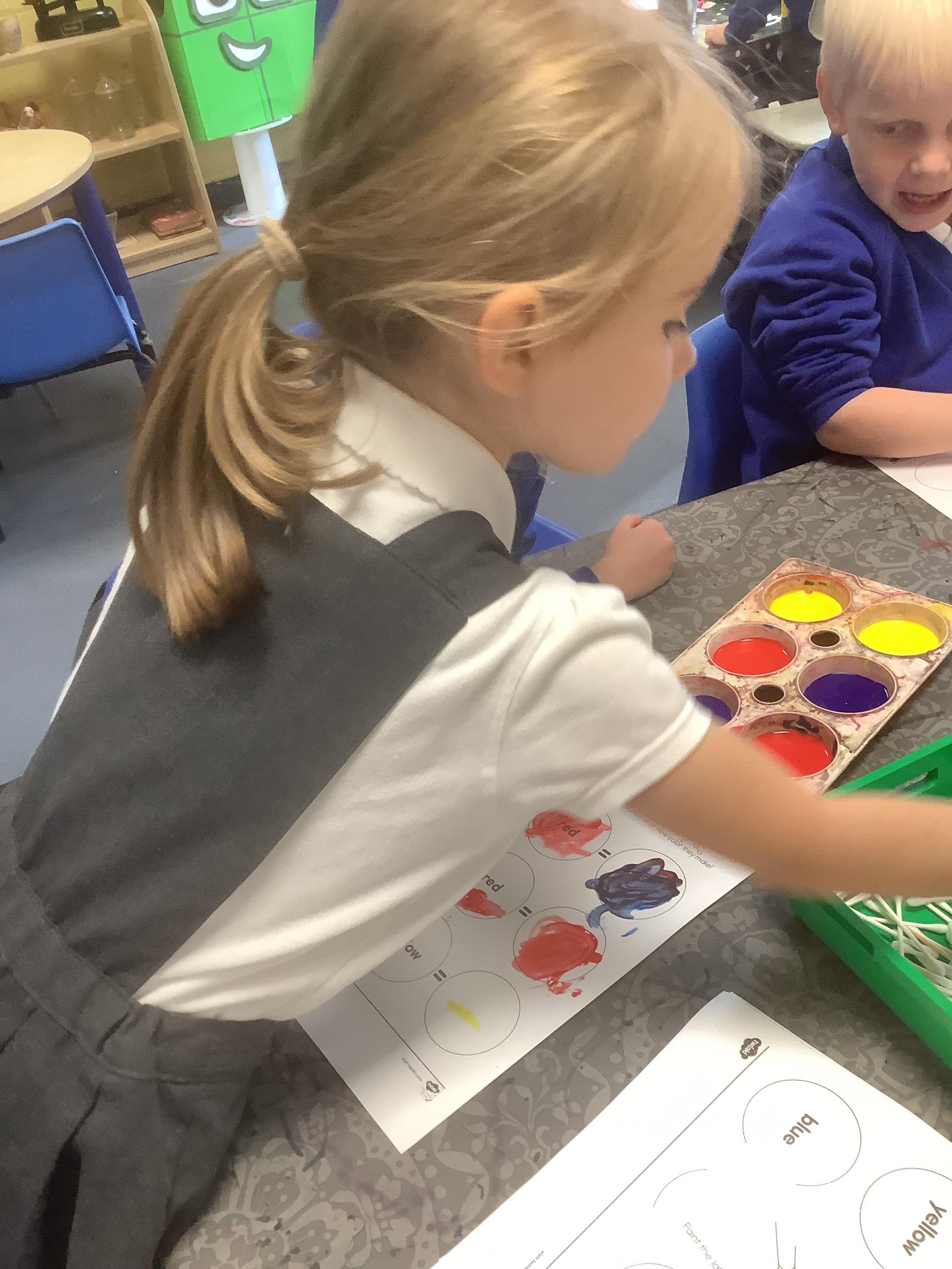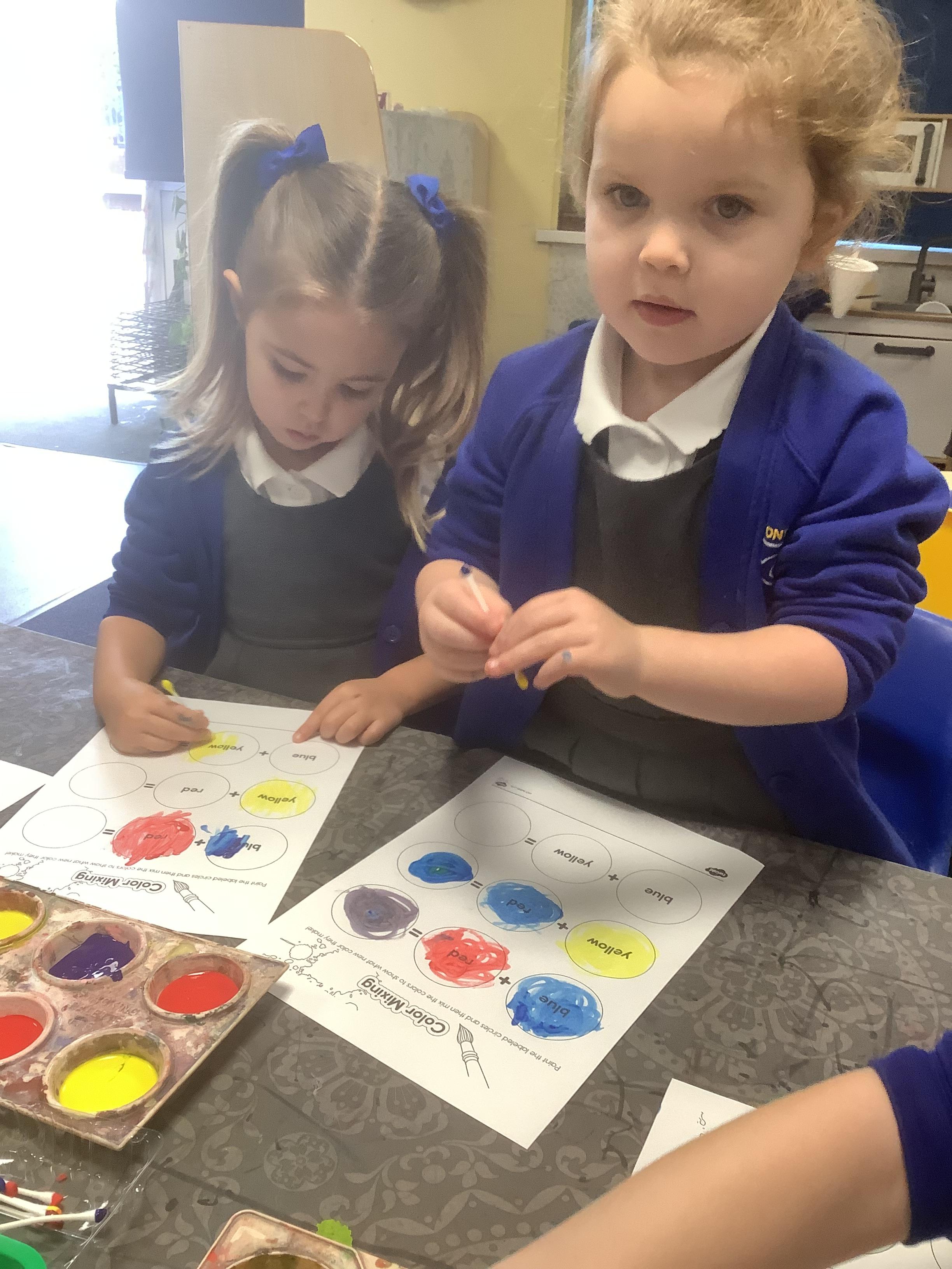 In Expressive Arts and Design, we have been exploring colour mixing. We learnt which are the primary colours and enjoyed mixing them to make secondary colours. We also learnt a colour mixing song and enjoyed singing it as we painted!