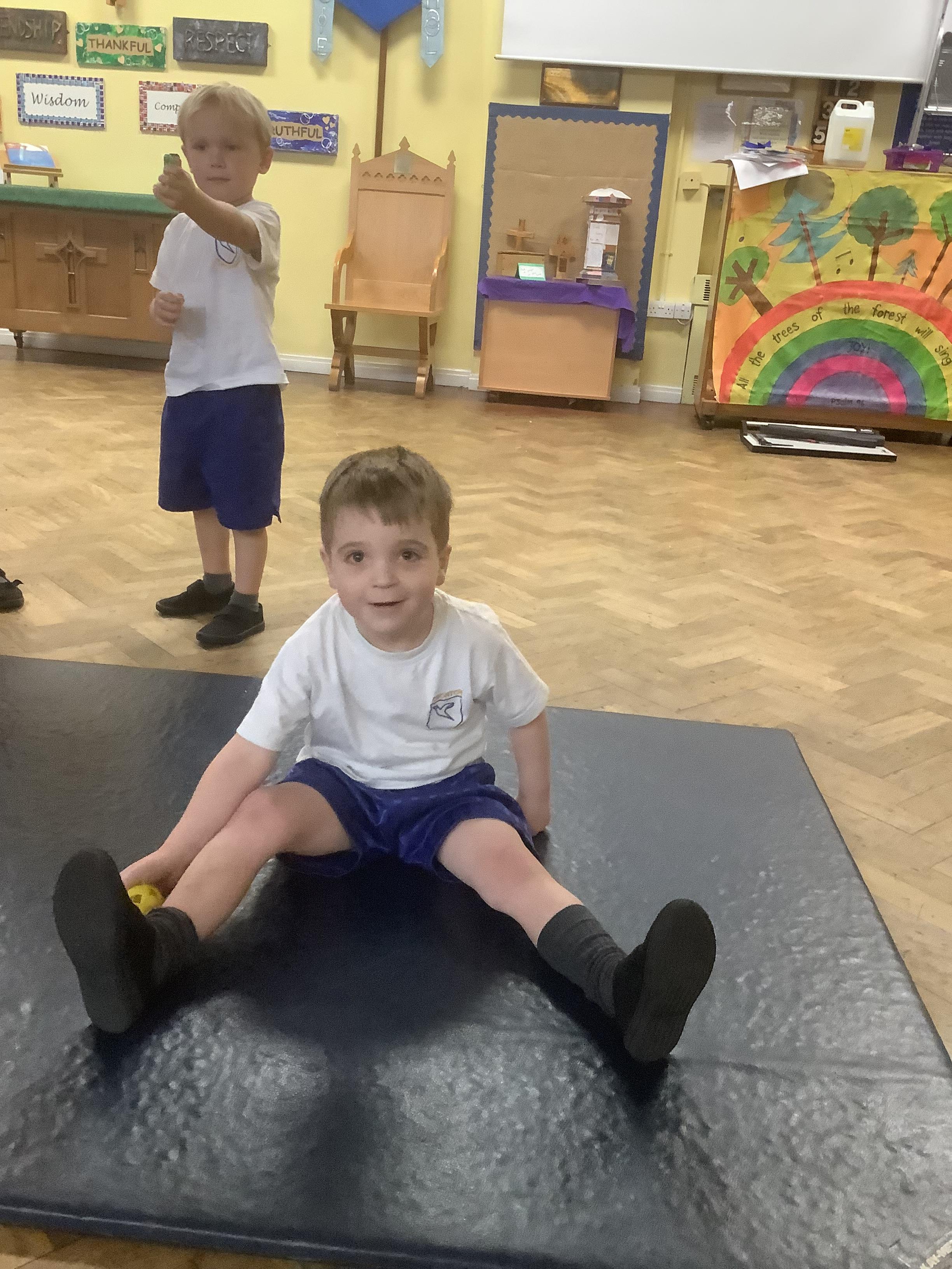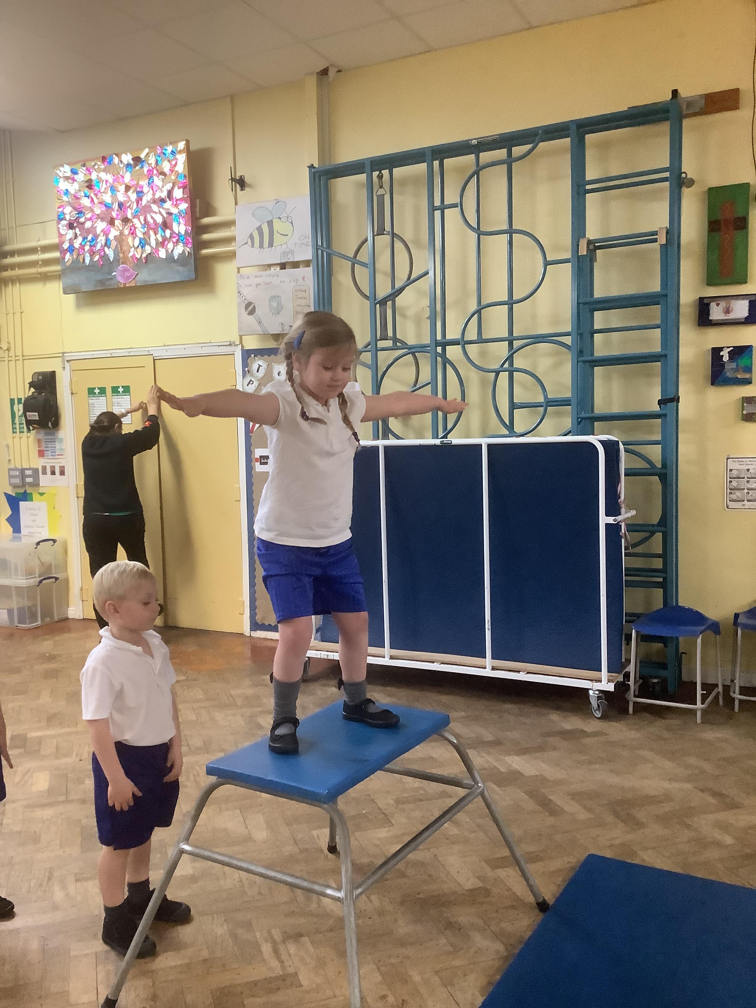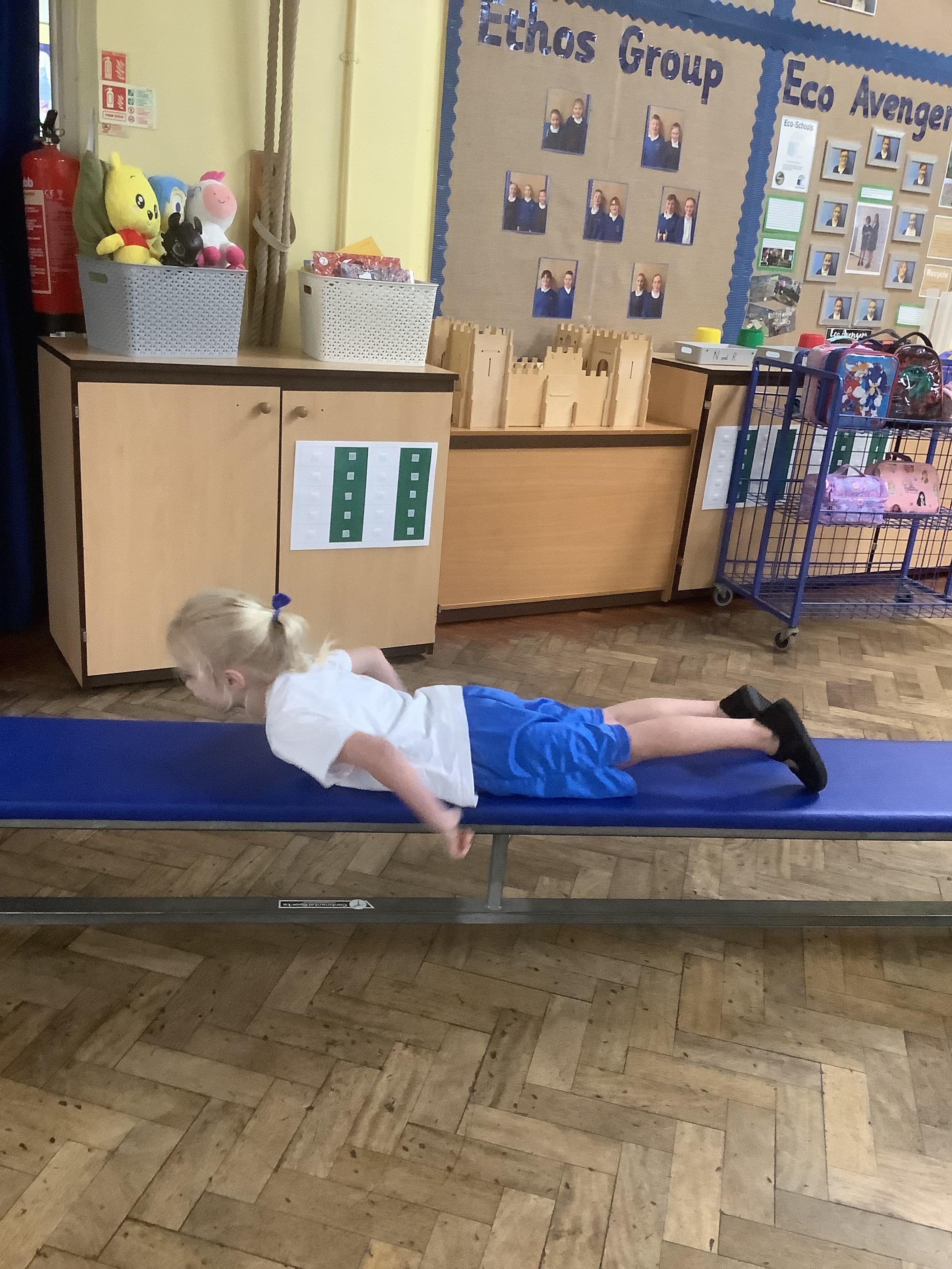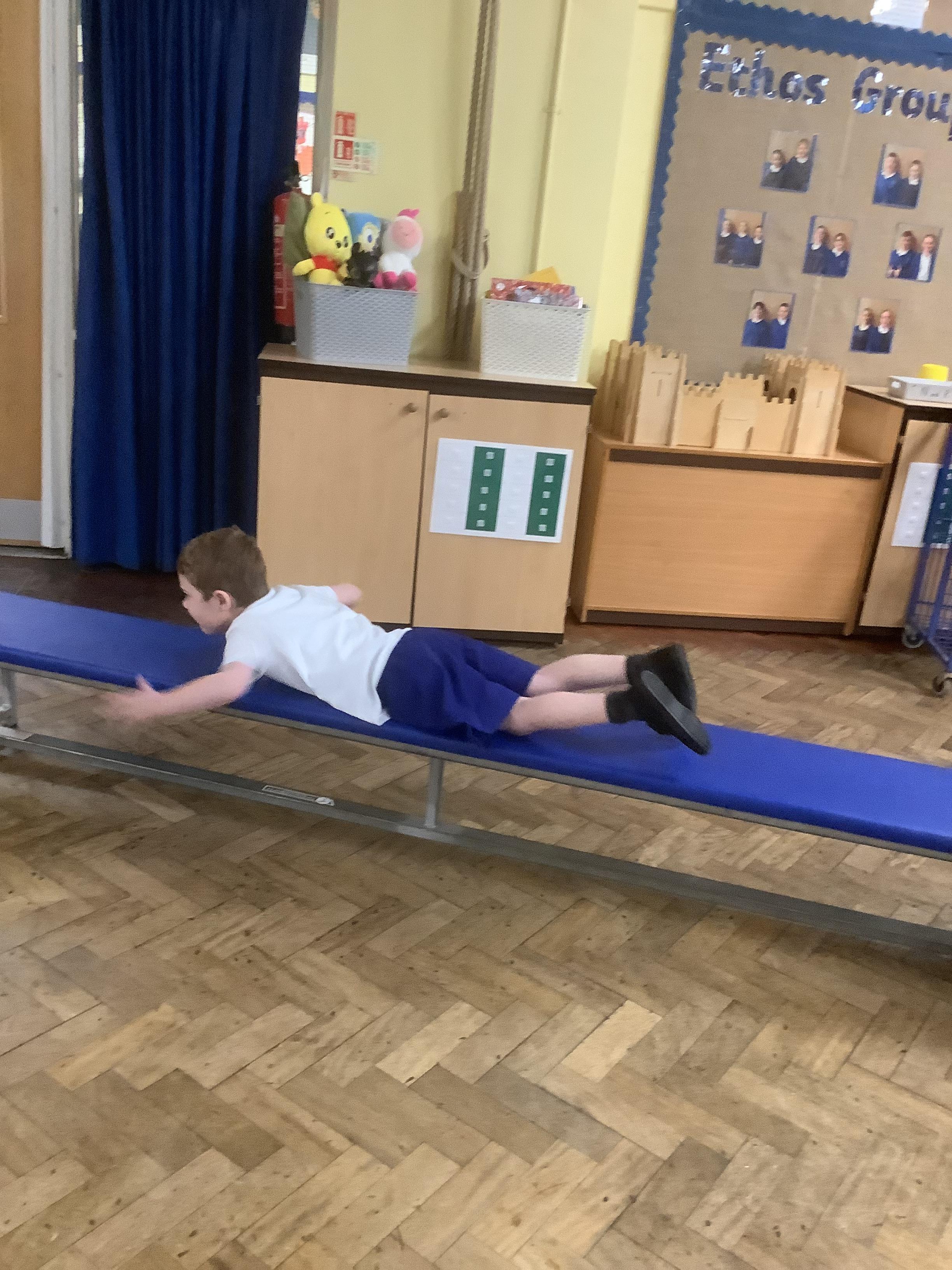 In PE, we have started our new unit of learning – gymnastics. We have been learning to make different shapes with our bodies including a tuck shape, straight shape, star shape and straddle shape. On Wednesday, we developed our learning by doing the shapes on different apparatus.