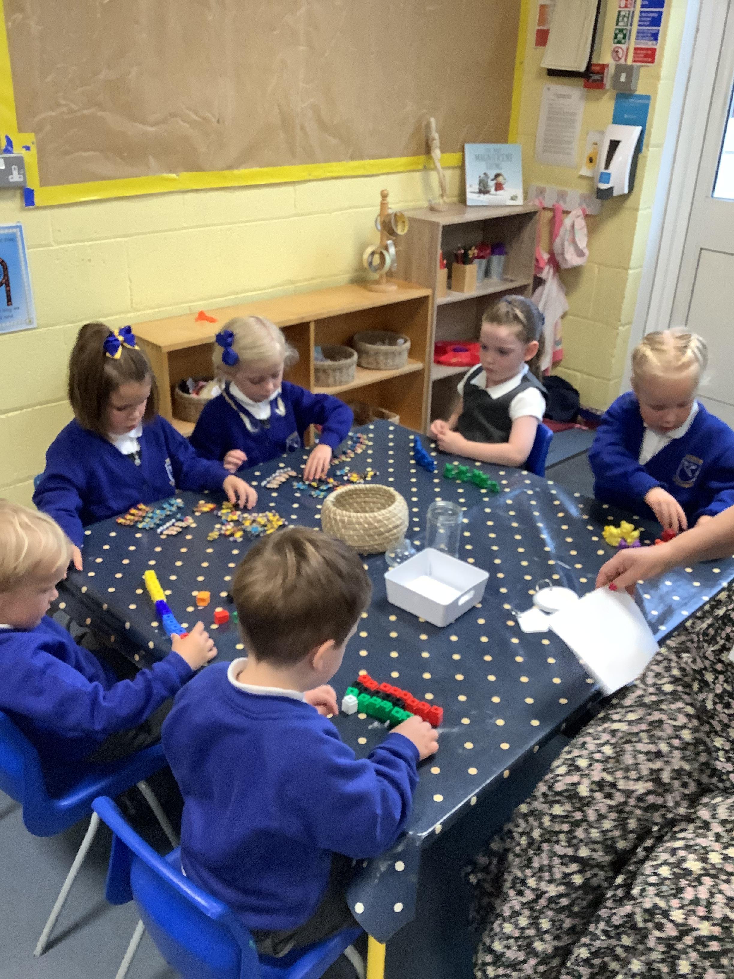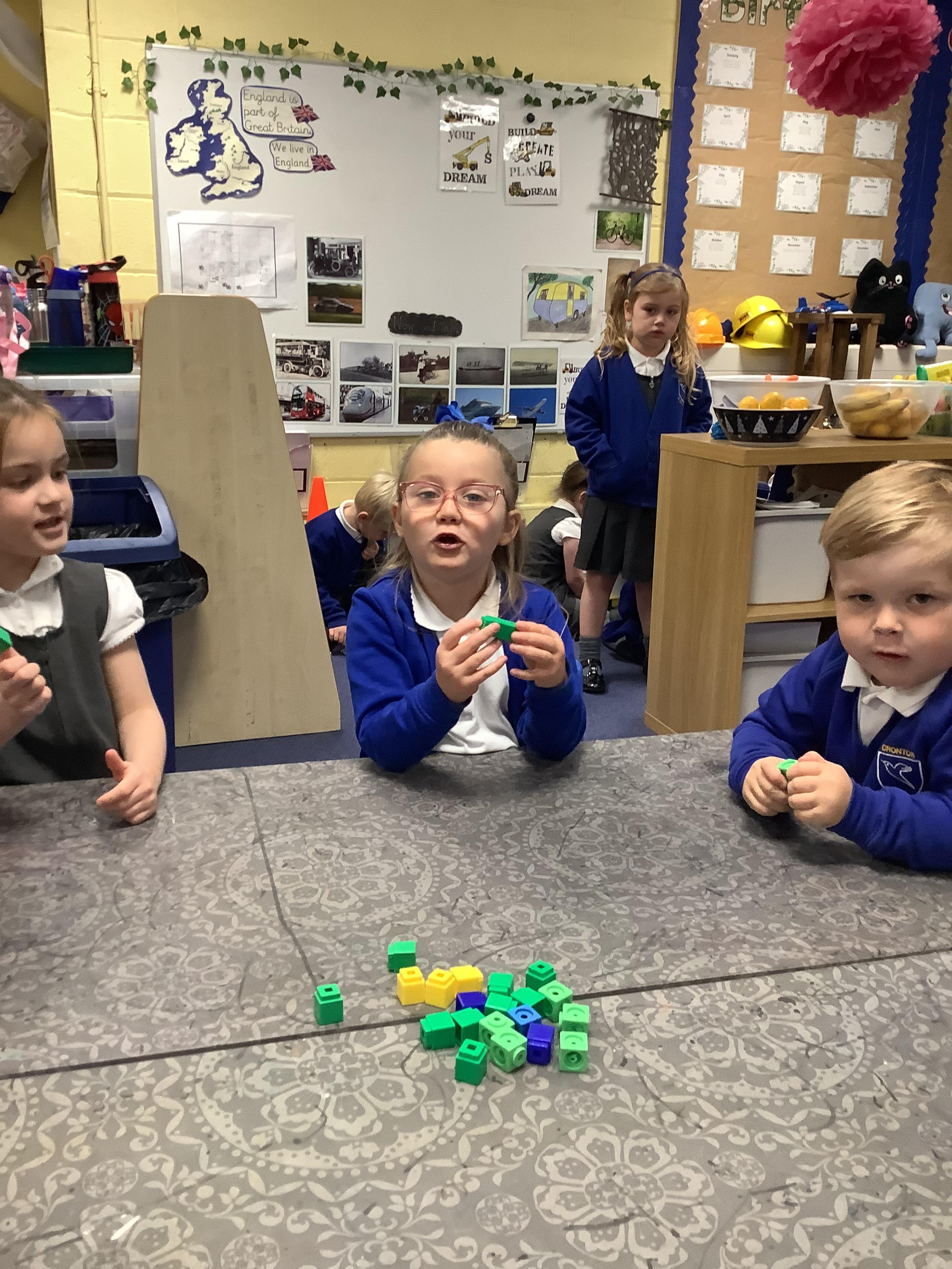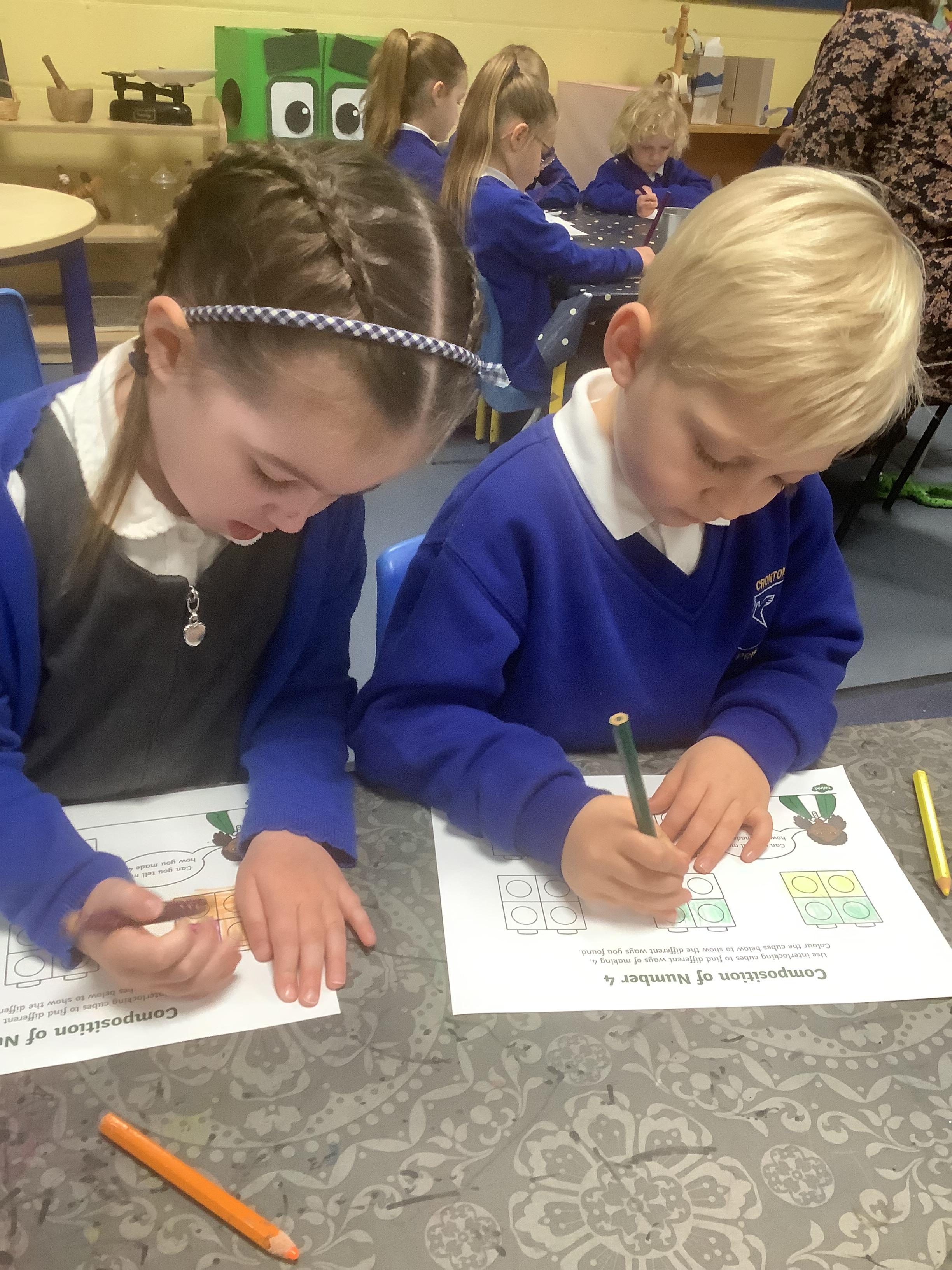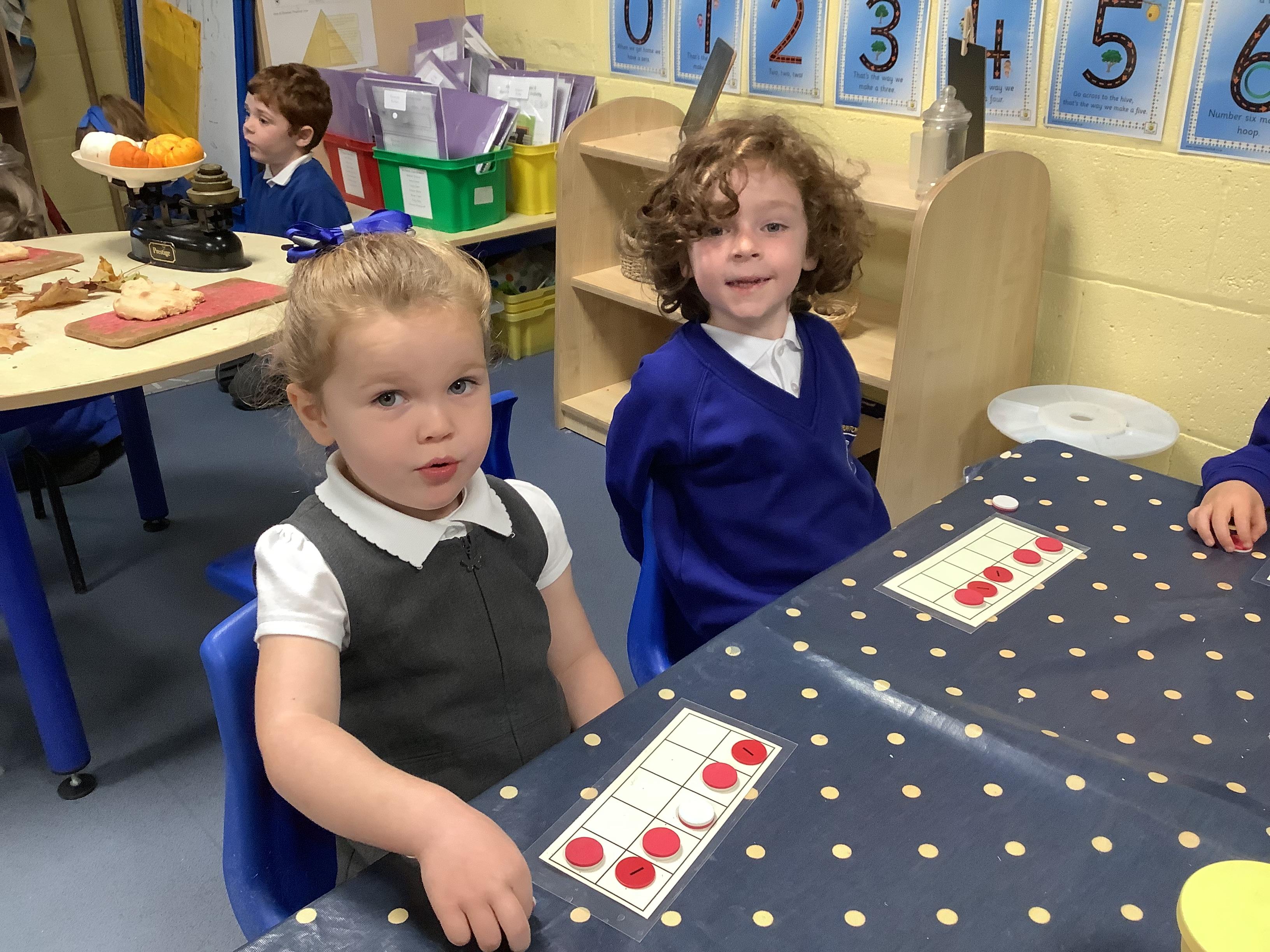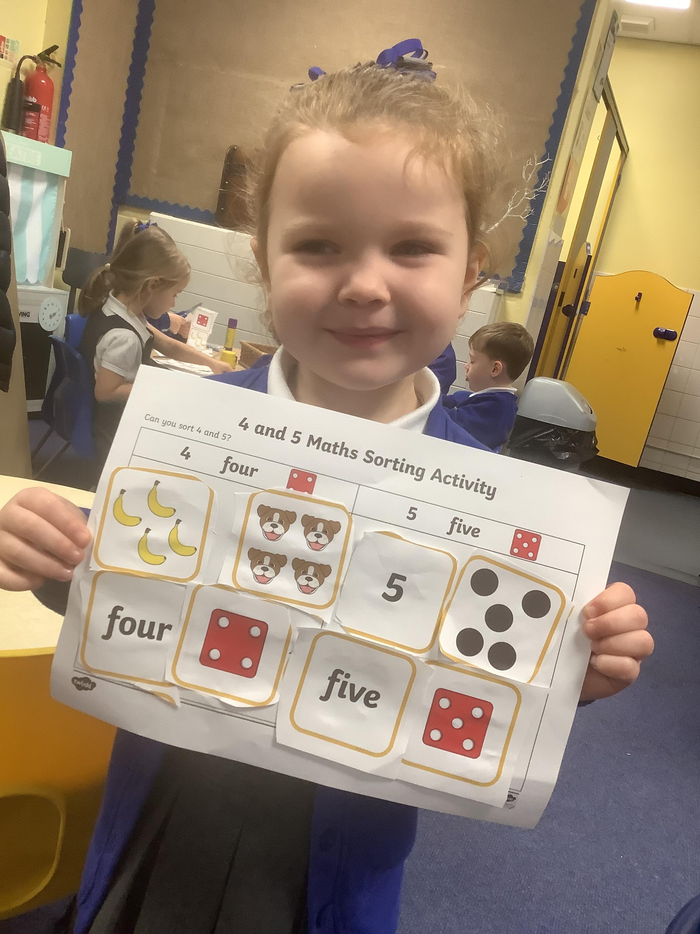 In maths, we have focused on the numbers 4 and 5. The children have been practising recognising the numerals, counting out sets of 4 and 5, and exploring how the numbers are made (their composition). Using counters, cubes, ten frames and practical objects has helped the children see how many different ways we can make 4 and 5.