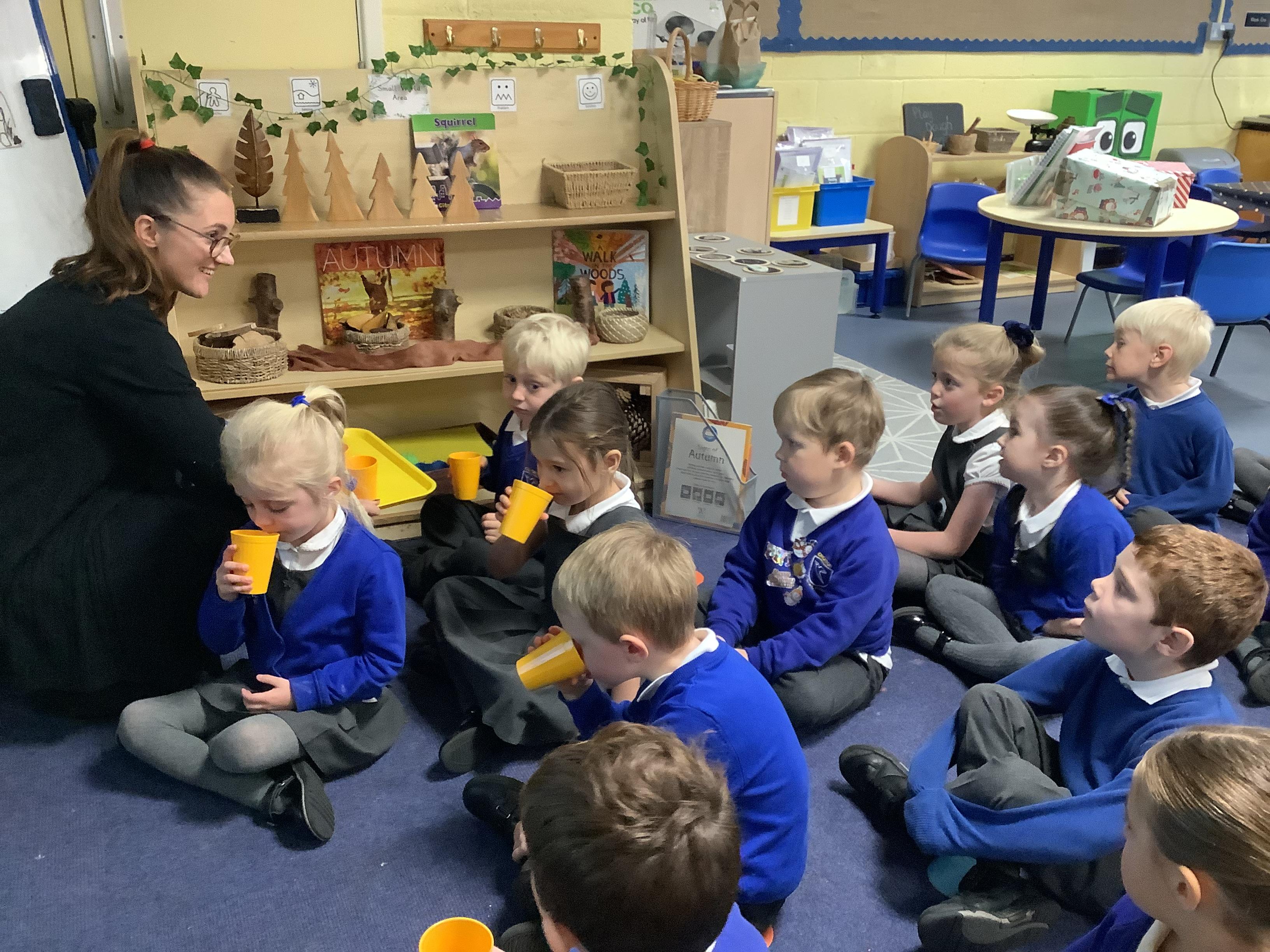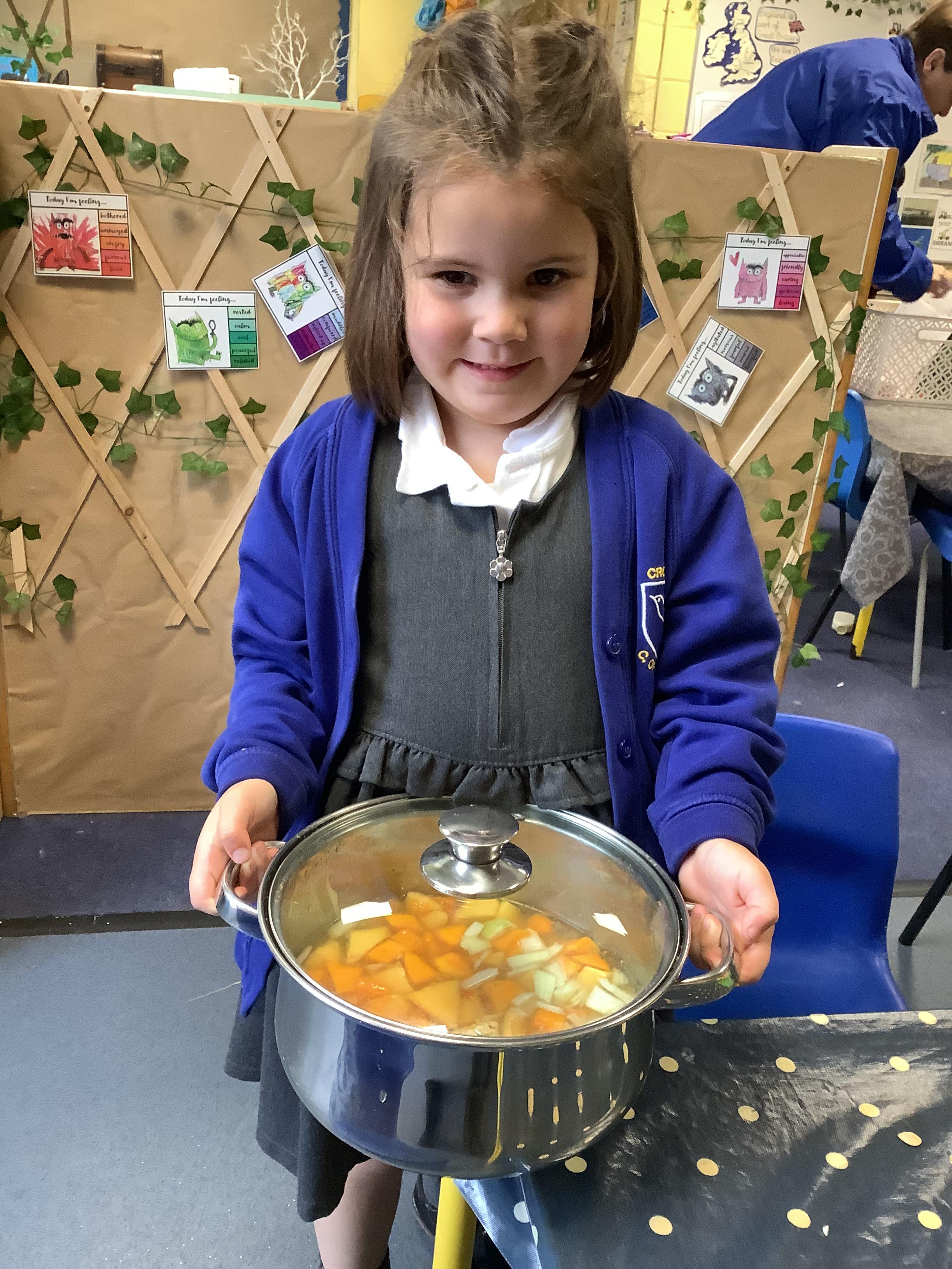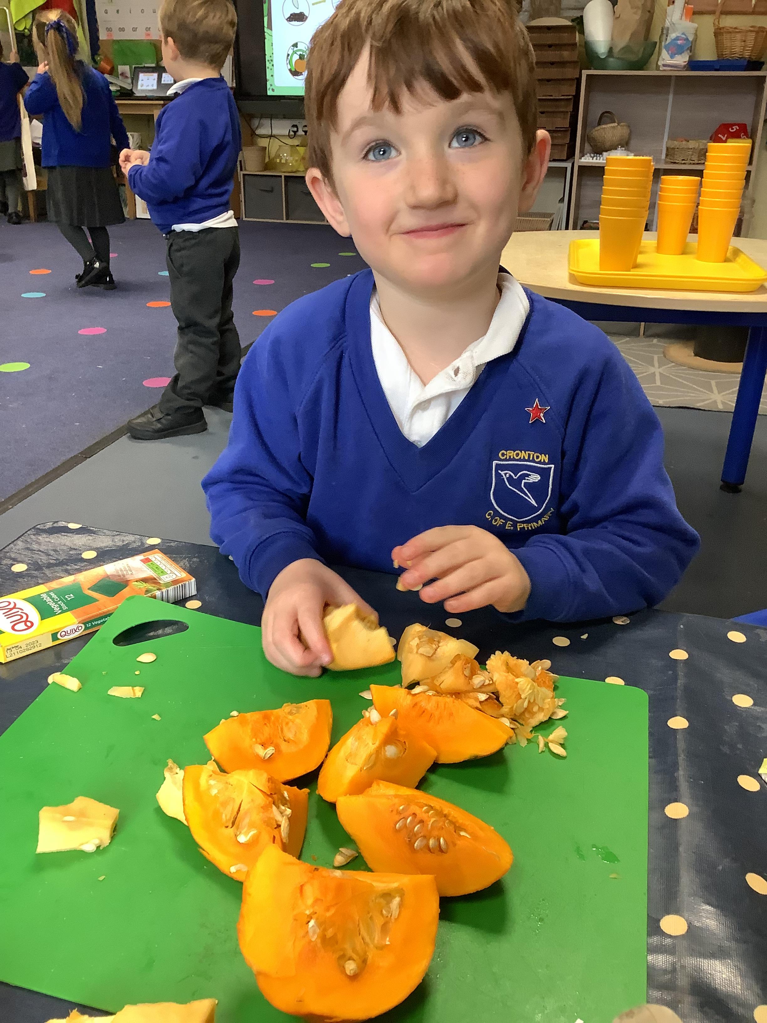 In Understanding the World, we listened to the story Pumpkin Soup by Helen Cooper. We then learnt about the life cycle of a pumpkin and compared it to our knowledge of the life cycle of an apple. After listening to the story, we decided to make our own pumpkin soup! We chopped, sprinkled and stirred! We tasted the soup when it was ready; some of us even had a second helping!