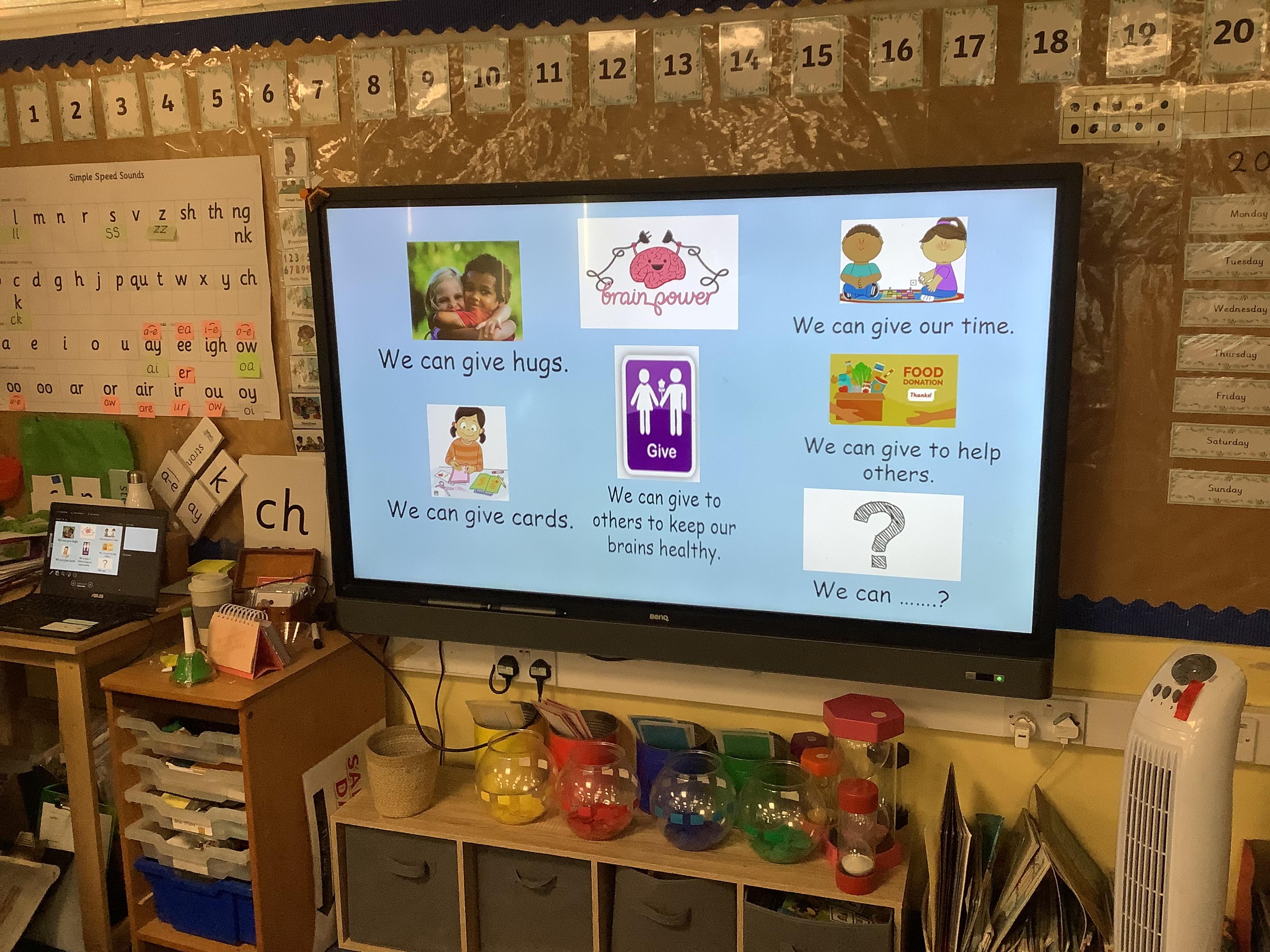 We thought about things that make us happy. Learning new things, spending time with our families and looking at rainbows were all things that the children suggested ����
