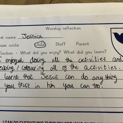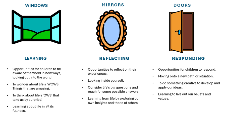 We have a Windows, Mirrors, Doors display in our school hall. Each week, worship is ended with a reflection and reflection questions are sent back to class. Children respond to these in their own way, at their own time, during the week.