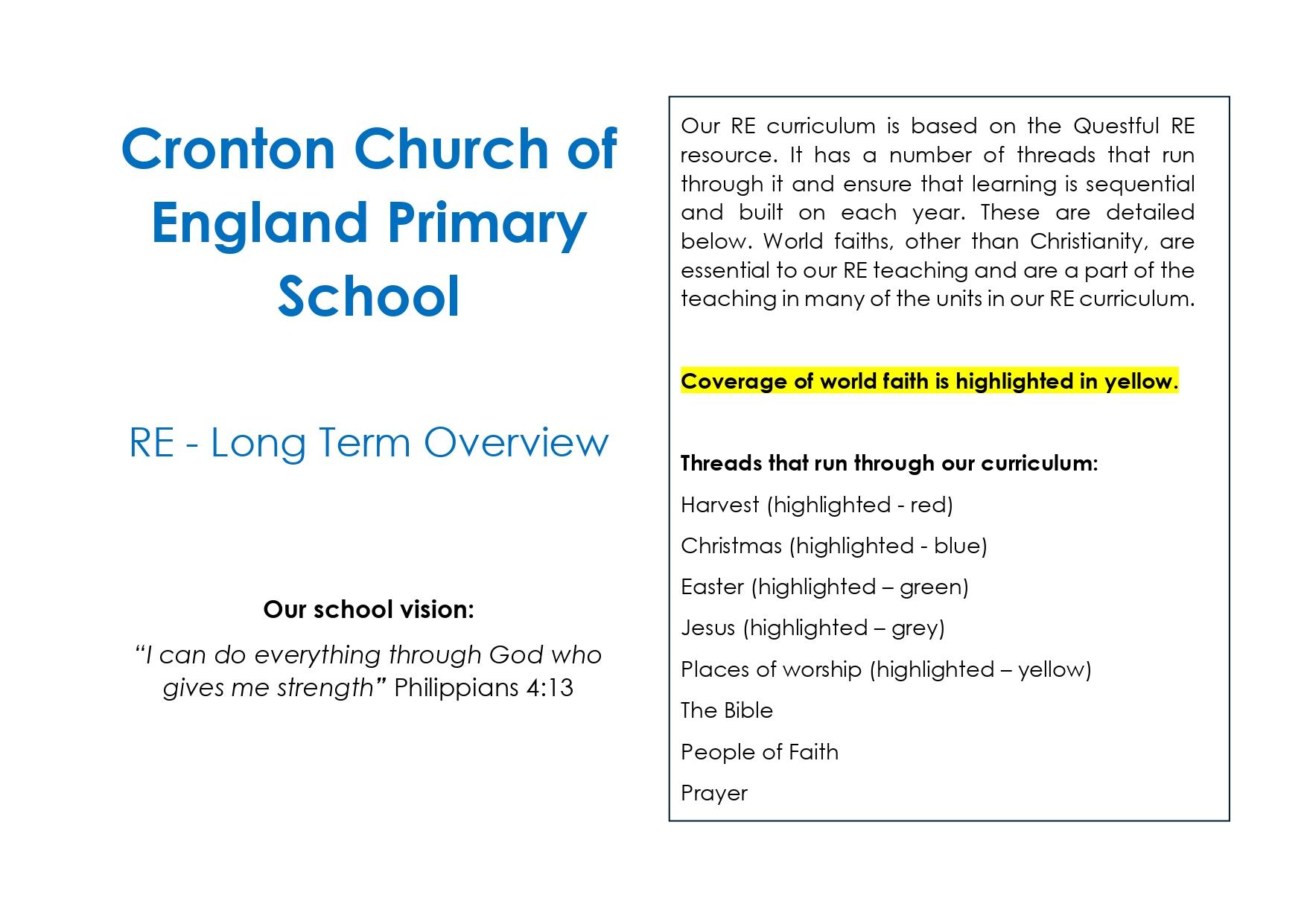 • The R.E. Syllabus for Primary School published by the Blackburn Diocesan Board be the main source for the planning and teaching of R.E. in Cronton C.E. School. The main resource is Questful RE.