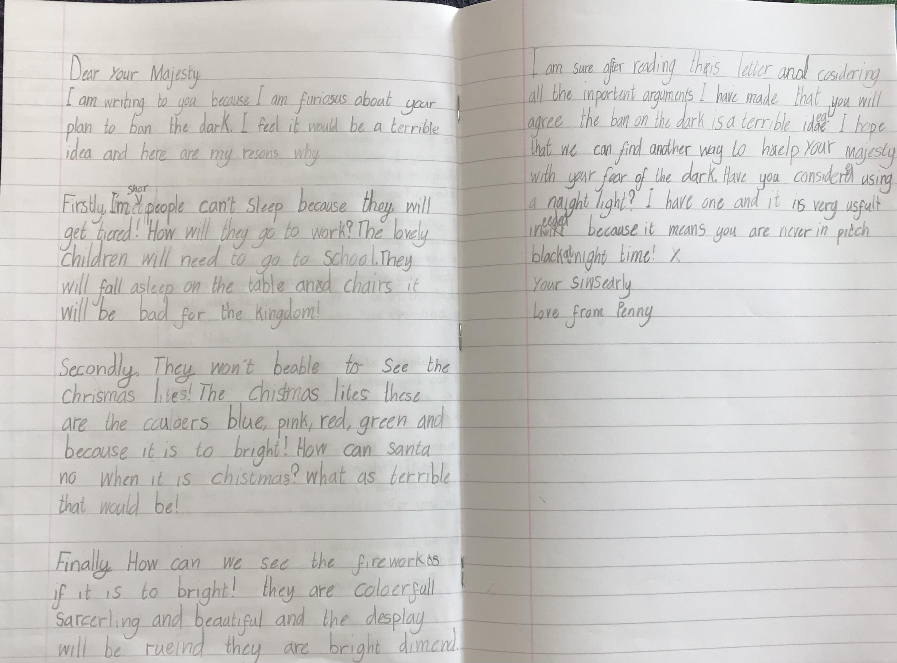 In English we wrote our letters to the King from our story trying to convince him not to ban the dark. We had to be very persuasive. I am sure you will agree, we put forward some very convincing arguments against his ban!
