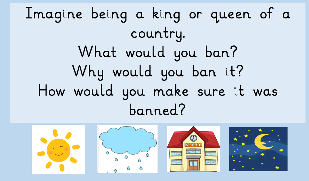 In our English this week we have started to write our own banning stories! If you were king or queen of your own land what would you ban? Why would you ban it and how would you ensure it was banned? We have come up with some great ideas!