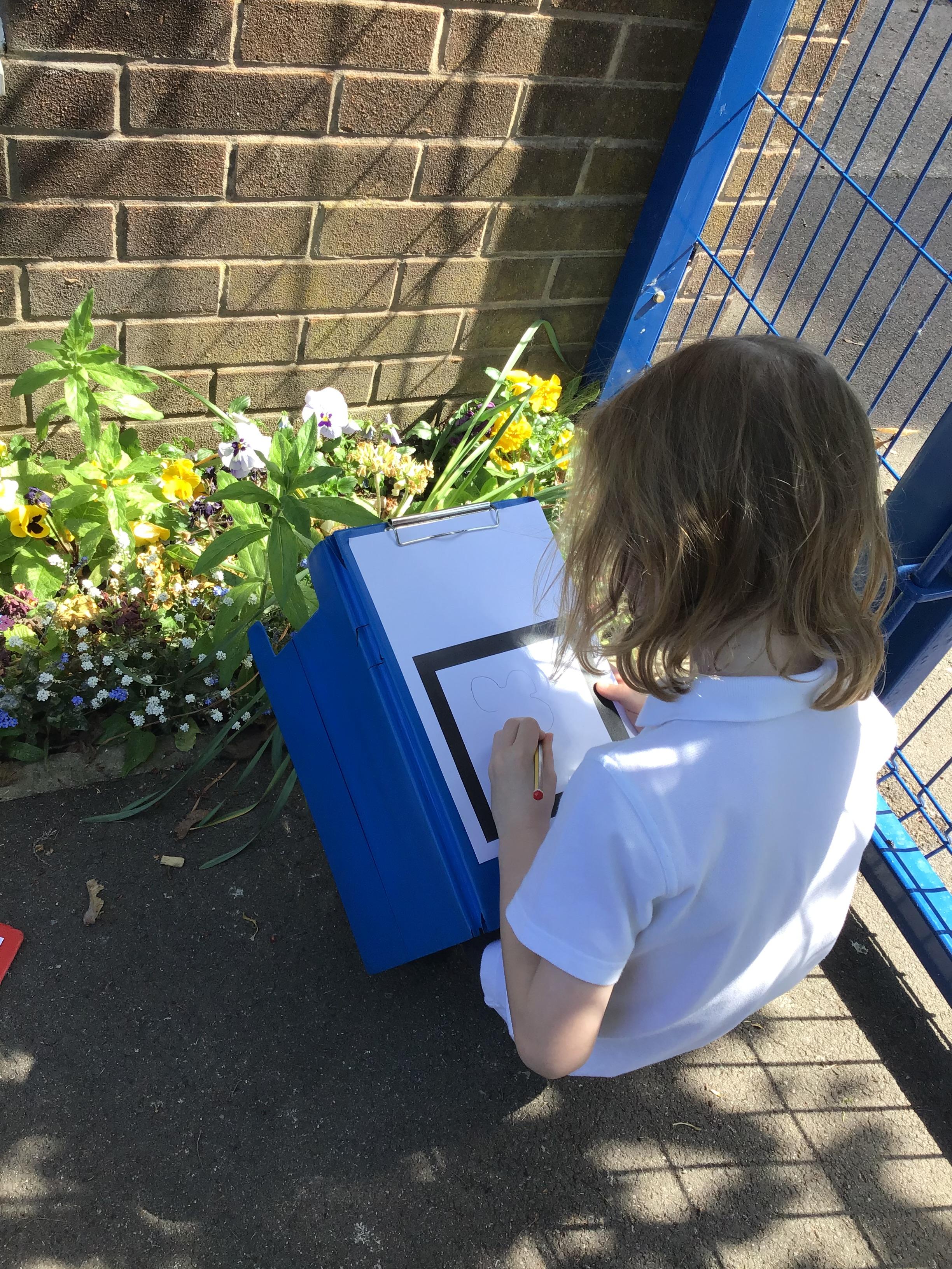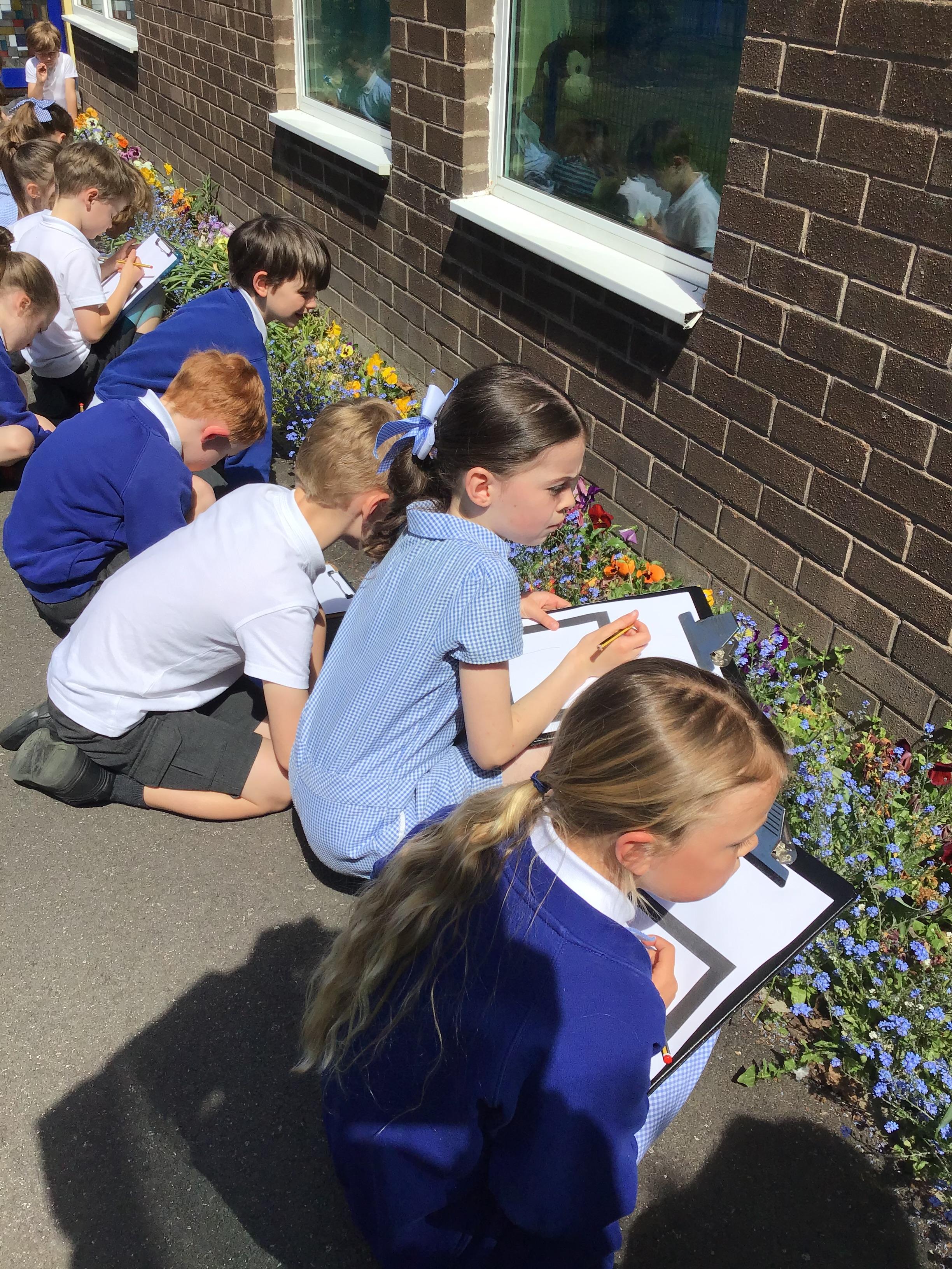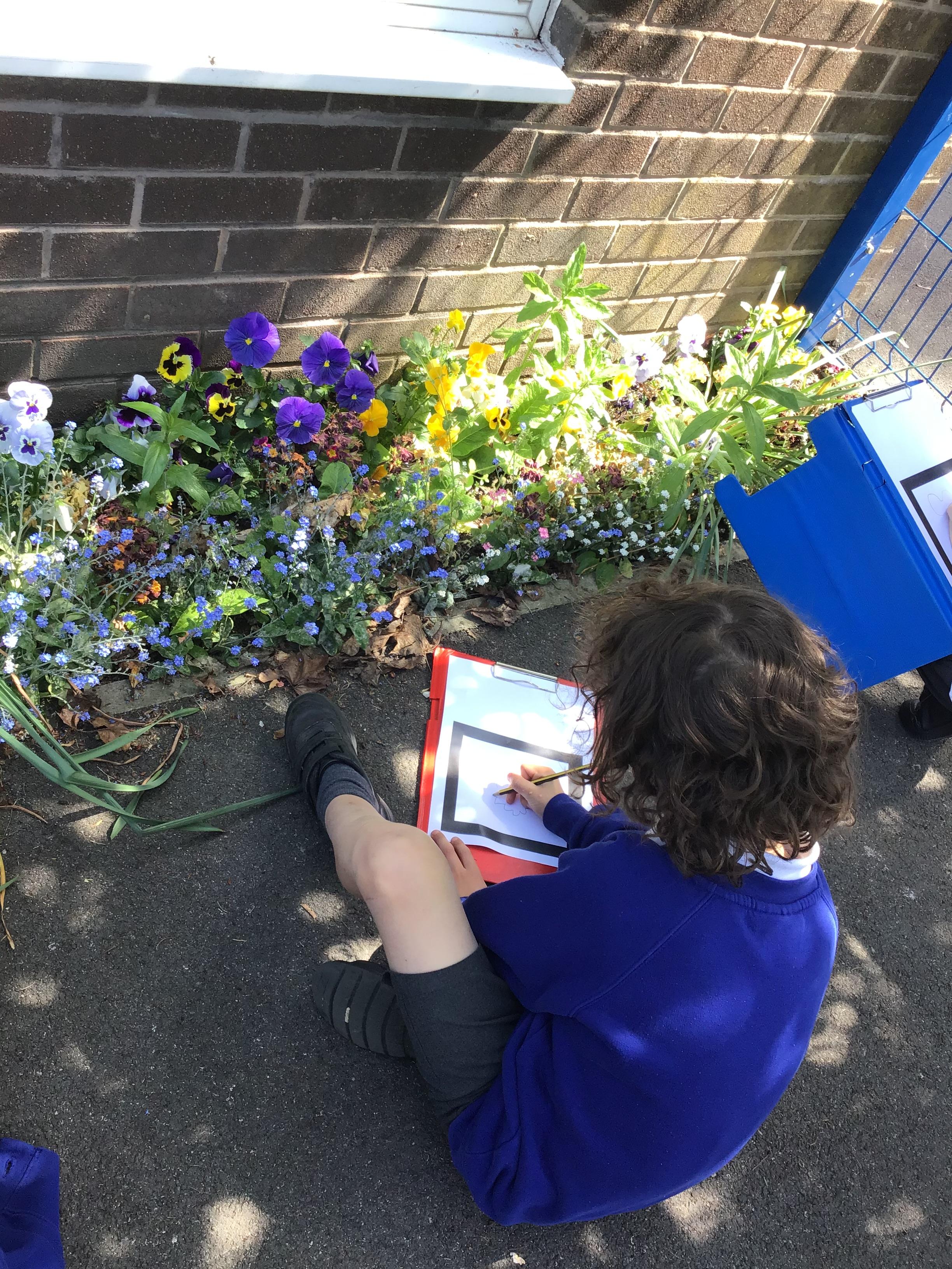 In Art and design this week we began to plan for our summer collages by going out and looking at flowers in the school environment. We then drew them as a starting point for our own design. We looked carefully at line, shape, colour and form.