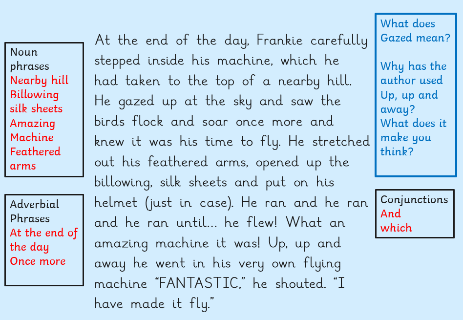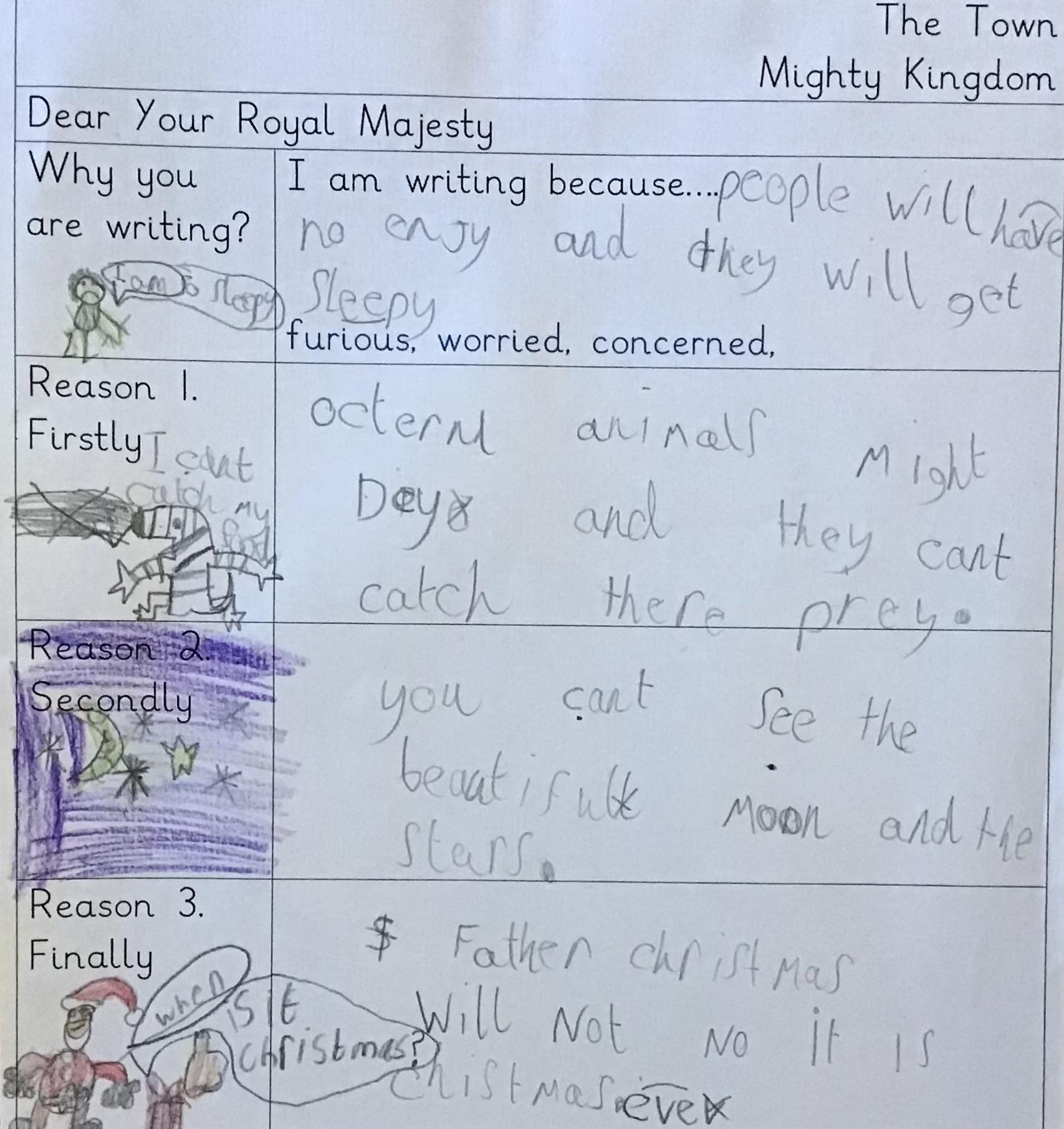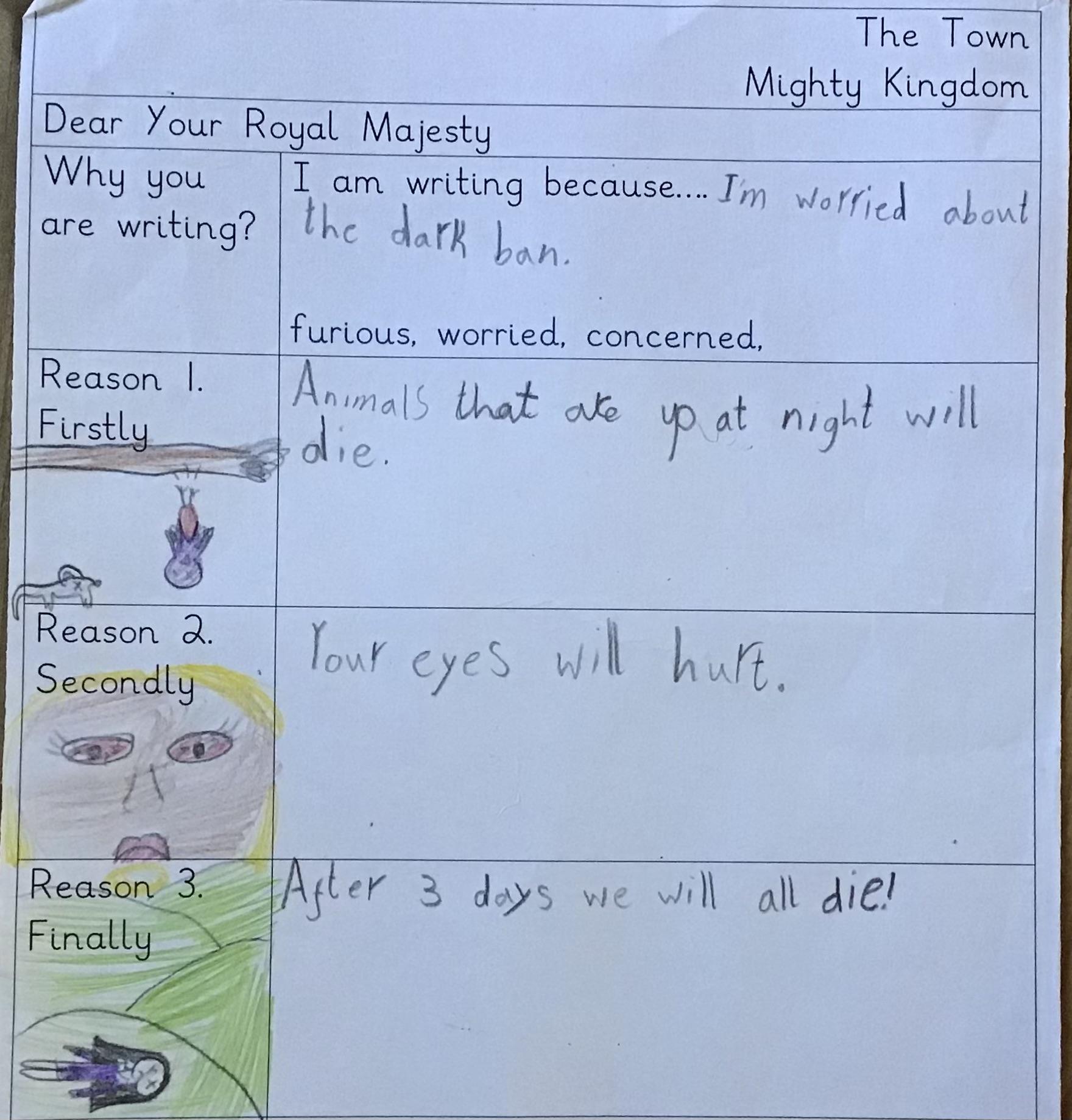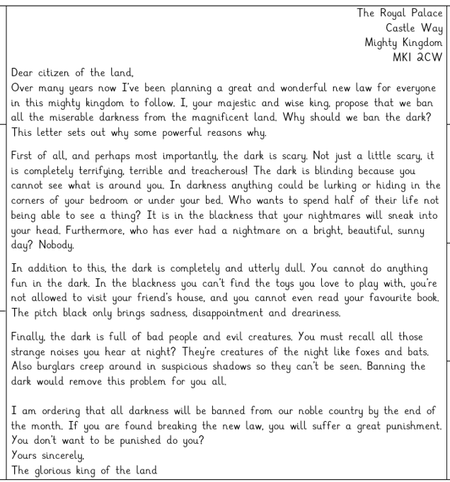 In our English we have been investigating the purpose of a persuasive letter and the features writers use to persuade us of something. We read a letter from the King from our story. What could he be trying to persuade us into believing? what language has he used to help make us agree with him? Can you find any noun phrases? Can you find any questions or exclamation sentences? What language has he used to make us feel afraid of the dark?